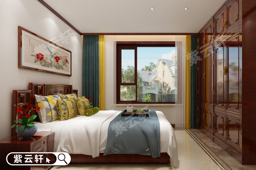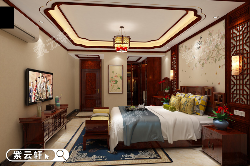 女孩房,格局方正的卧室空间将周边花格是古韵发挥到极致,背景处恬静的花鸟图将中式风格体现出丰富包面的一面,两边的挂落装饰其中更是美轮美奂,一装一饰皆显体现女孩温婉柔美的气质。