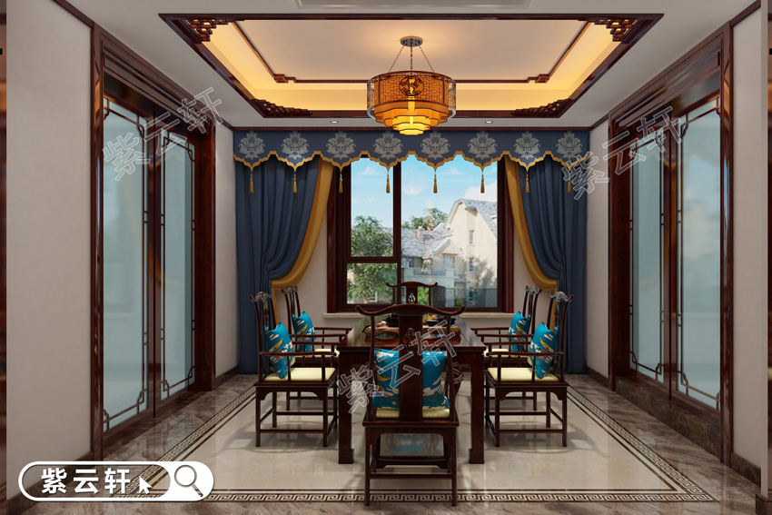 餐厅,华贵的座屏椅组合奠定了整体格调,在圆形仿古宫灯的衬映下更显温馨典雅,背景处一幅大篇幅描绘的山景图,将传统艺术体现的游刃有余,简洁的空间不需要过多的装饰,恰到好处的点缀才是最适合的。