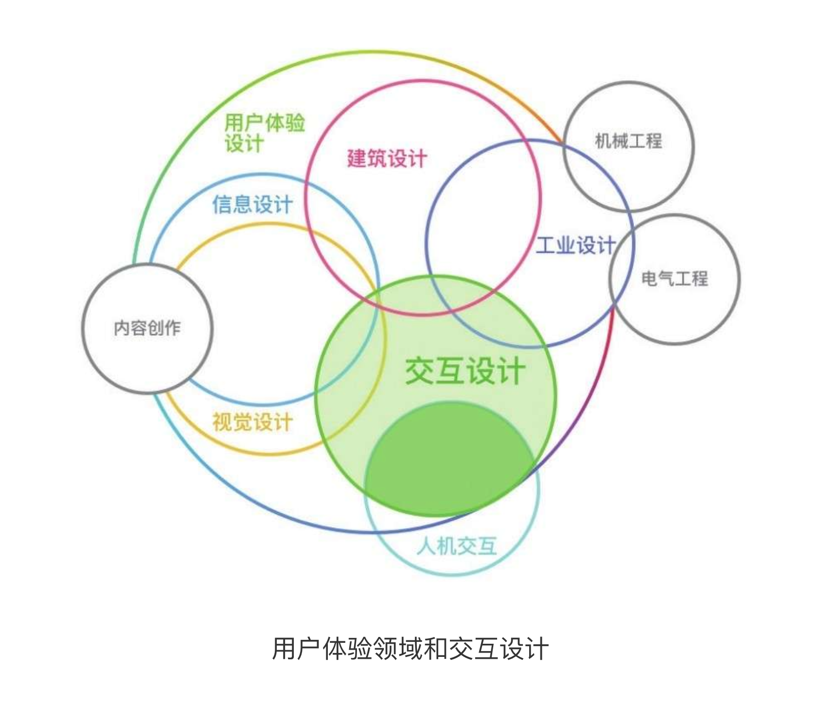 交互设计之父艾伦·库伯在其经典著作《About Face 4:交互设计精髓》里对交互设计如此定义——交互设计是设计可互动的数字产品、环境、系统和服务的实践。这个定义其实有点难理解,不是很具象,但这个定义告诉我们,交互设计覆盖了很多领域,它和很多设计都有重叠,交集。作者他也整理了一个图,从这个图里我们对交互设计会有更直观的了解。
