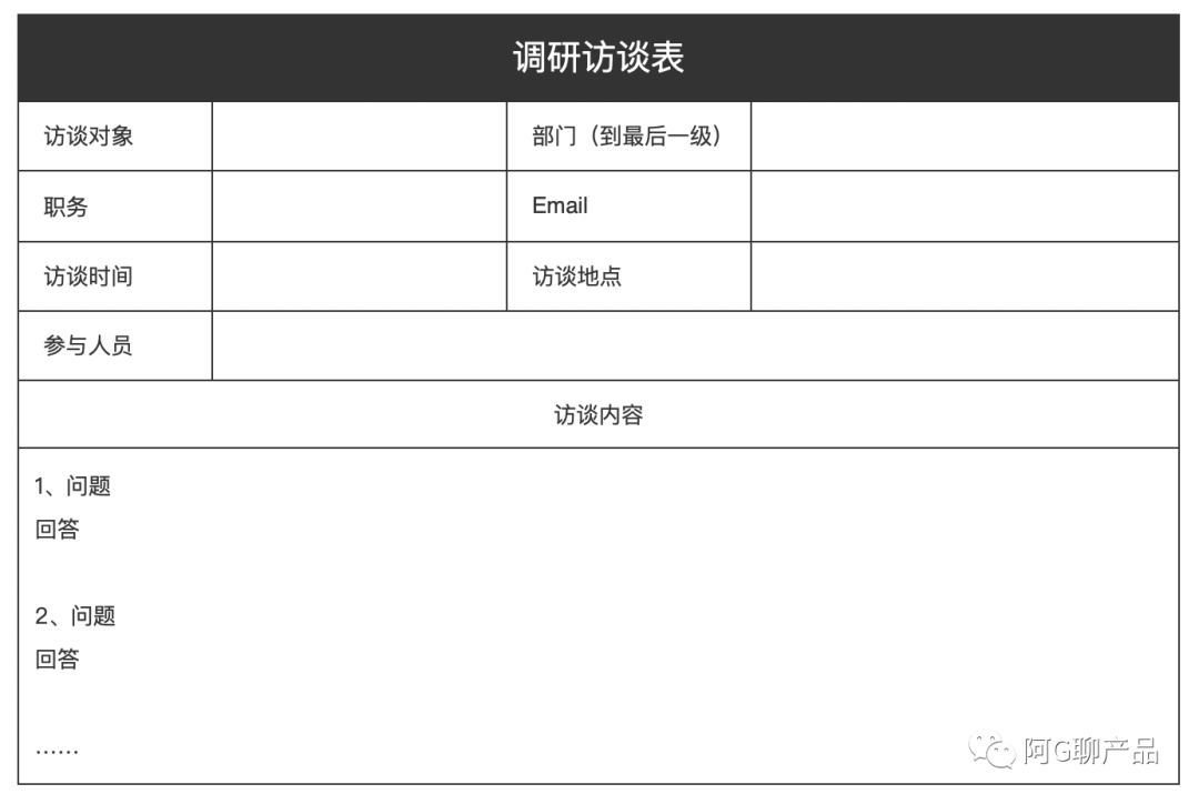 例如,被访者的姓名、部门、职务、联系方式——可以是电话或者Email;访谈时间、地点和参与人