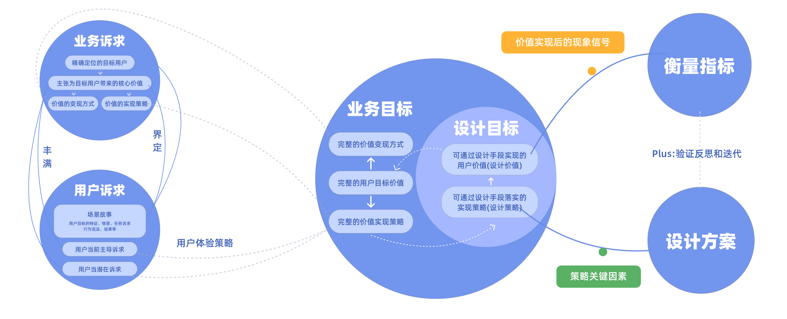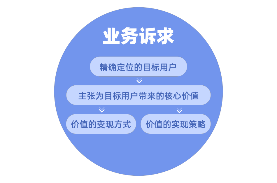 第一步我们需要了解的是业务诉求,它包含了4个方面的内容:精准定位的目标用户、主张为目标用户带来的核心价值、价值的变现方式、价值的实现策略.其中前两个部分界定了我们洞察用户诉求时的切入点,即场景故事的目标用户、核心价值的判定.通过场景故事我们挖掘到用户当前的主导诉求与潜在诉求,这些结论又丰满了业务诉求中主张的为目标用户带来的核心价值.通过这些推导过程,我们得出了完整的目标用户价值.有了这些价值就能推导出完整的价值实现策略和完整的价值变现方式.这三个部分构成了我们的业务目标.设计师在设计策略中思考可以通过设计手段落实的实现策略就是我们的设计策略,当我们落实实现策略的时候一定会有现象发生,这些用户价值的变化就是我们的设计价值.价值实现后一定会有现象信号发生,根据VSM原则我们制定了衡量指标.根据SKS原则我们得出了设计方案.这就是整个的思考路径闭环.