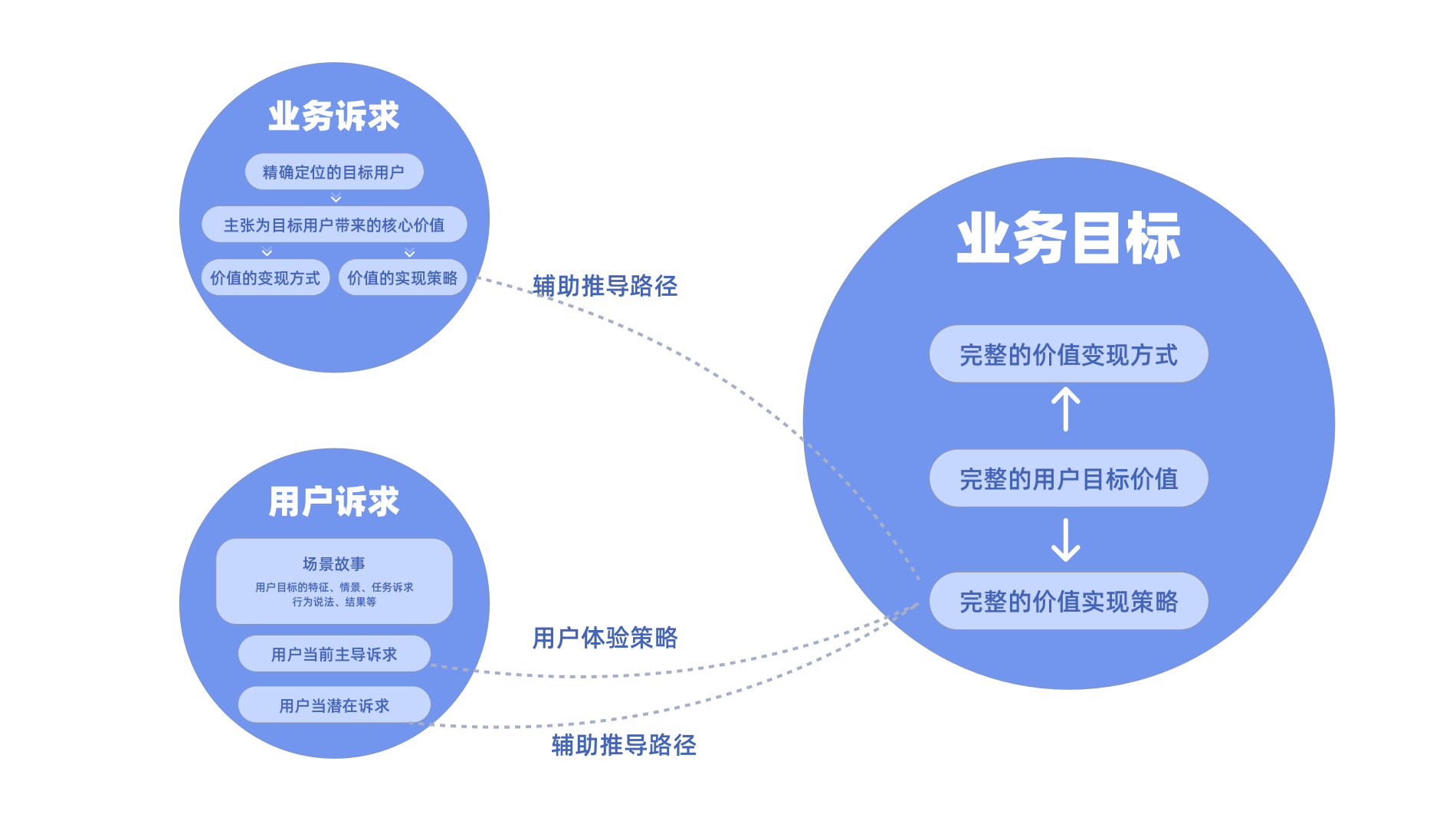 我们得到了深刻且立体的用户诉求,其实就明确了可以在哪些维度和层次对用户提供更多的价值,这些丰满了在业务诉求中主张的给用户带来的核心价值.形成了比较完整的目标用户价值,有了目标用户价值我们就可以推导出完整的价值实现策略,和完整的变现方式,通过主要推导路径和辅助推导路径我们可以得出业务目标的三个内容,即完整的目标用户价值、完整的价值变现策略、完整的价值实现策略.