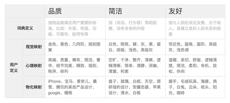 1,原生关键词,通常是抽象词汇,简单说就是用词语概括我们希望传达给用户什么样的品质,用户希望我们具备哪些品质也就是我们的产品的核心价值所在.如理财产品的词汇是“友好”“品质感”“安全”“可靠”等.这些是我们构建设计价值观的基础.需要注意的是这些传递给用户的价值观不是由设计师冥思苦想出的,是由产品顶层设计人员来定义的.所以需要我们与相关人员反复沟通确认.由他们来告诉我们,或者与他们一起来探讨.必要的时候让他们参与我们情绪板的制定工作.