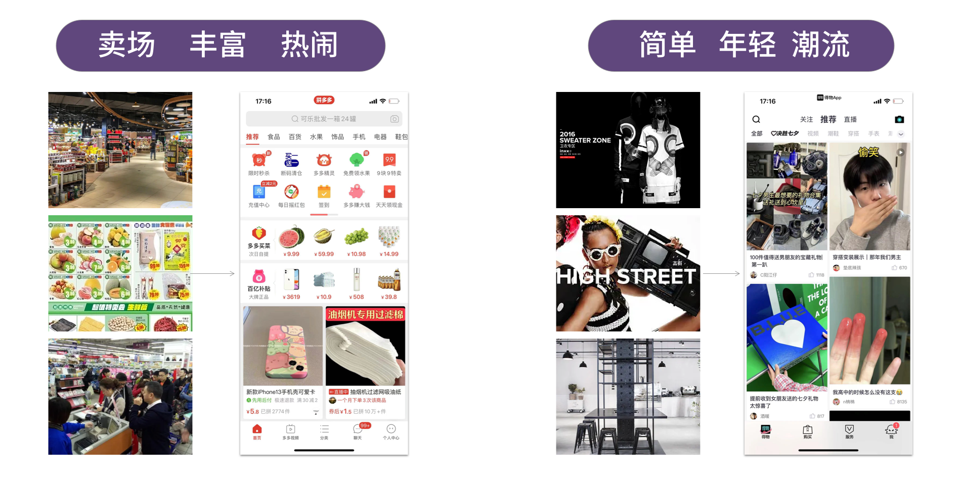 拼多多这种综合类型的平台,品类丰富、用户范围广泛,在布局的时候就需要结合人群的线下行为喜好,给用户多个入口,卡片之间水槽的宽度适宜.得物app垂直电商平台,主要针对潮男潮女,他们喜欢直接、简单、大胆的产品,在首页去掉了分类入口,直接展示商品卡片流,满足用户的需求.