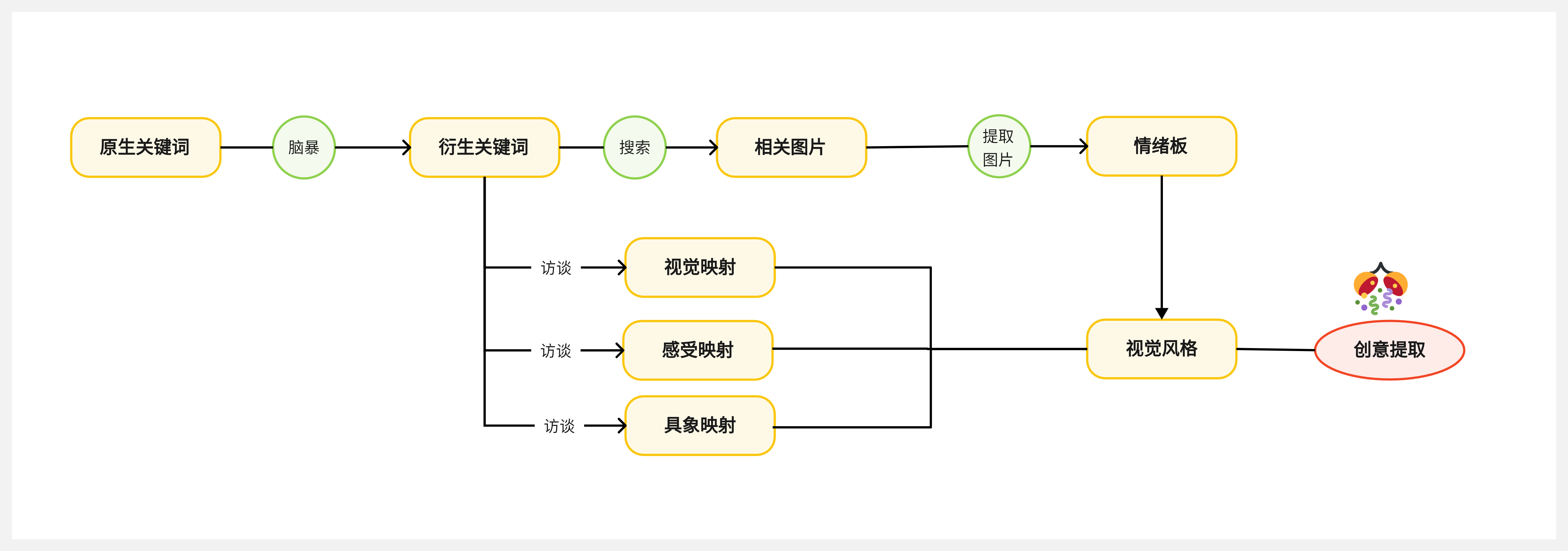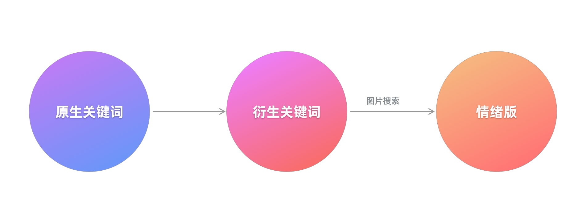 情绪板的实施分为3个步骤:原生关键词(抽象词汇)、 衍生关键词(具象词汇) 和图片搜集(衍生关键词映射)