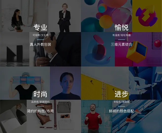 要有结果.产出情绪版只是我们整理视觉思路的一个过程,我们使用工具的目的是帮助我们得出结论,通过情绪板分析整理出视觉风格的定位才是我们最终要输出的结果.情绪板的终点不是图片合集,是通过图片合集挖掘出来的设计风格和品牌色的提取.视觉风格可以分为五个方面进行整理.颜色、字体、构成、图形和质感.
