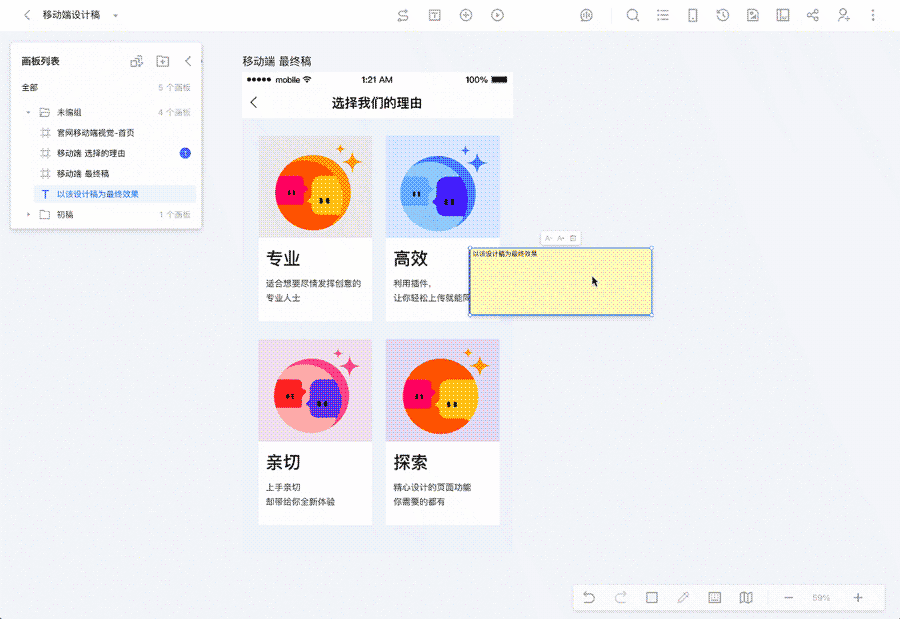 在画布视图下,当备注卡片的大小和设计稿大小无法匹配时,你可以通过缩放备注卡片和调整文字的大小,让备注卡片显示在更合理的位置。