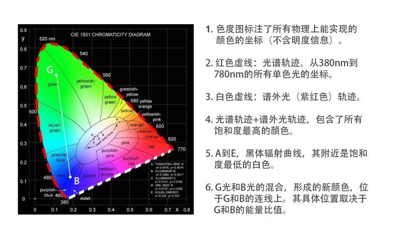 好了,看懂这几条基本就够用了。有了色度图的帮助,原来的很多概念就能得到非常直观的呈现: