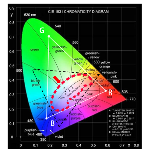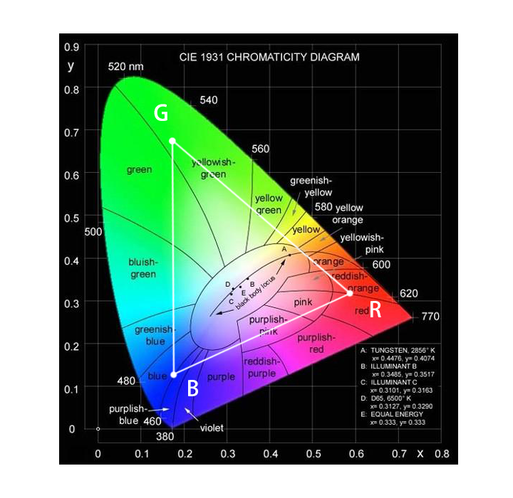 三原色覆盖的范围,一定要大于这个区域,否则某两个原色相加,可能会出现白色,或者是混合出来的新颜色饱和度太低没法看。。。