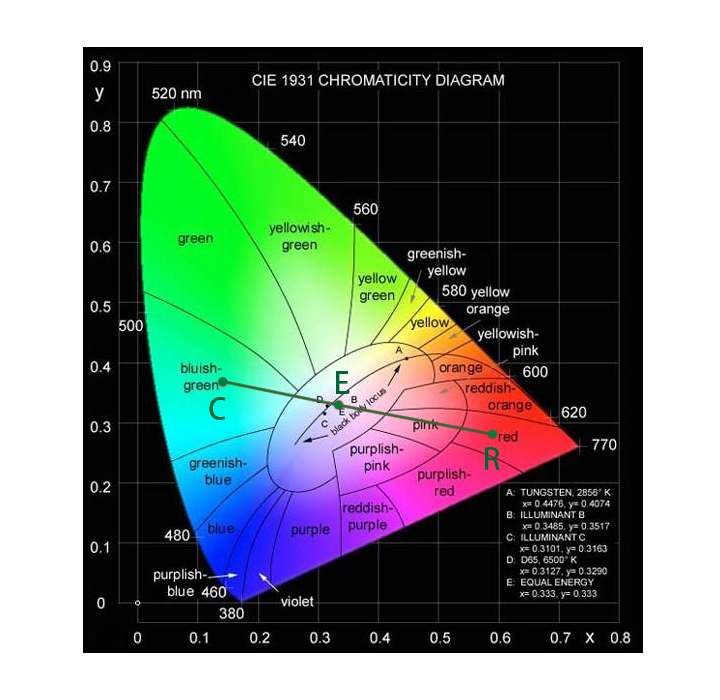色度图上任意两点的色光混合,新生成的色光,其坐标一定在两点之间的连线上。哪一边的信号强度大,就更靠近那一边。嗯,大概就是这样,谁劲儿大谁赢:
