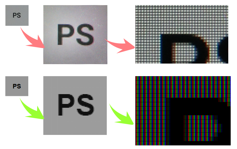 图像被分解为按矩阵排列的像素(pixel),每一个像素又分为3个不同颜色(R\G\B)的子像素(sub pixel)。