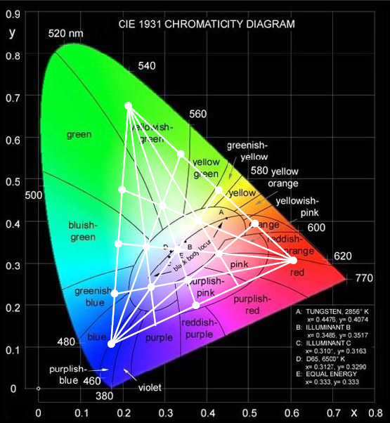 RGB三原色在开和关之间能形成的中间状态越多,混合色的比例种类就越丰富,这个“蜘蛛网”也就越密,在色度图上能形成的新颜色自然就越多了。