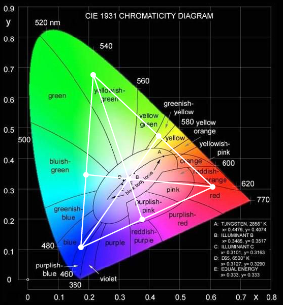 另外,可不可以不用RGB做三原色呢?当然可以,色度图上其实可以另选出3个不在一条直线上的点,只要能形成一个三角形,而这个三角形还可以把白色区域包含进去,就可以做三原色,参见下图。