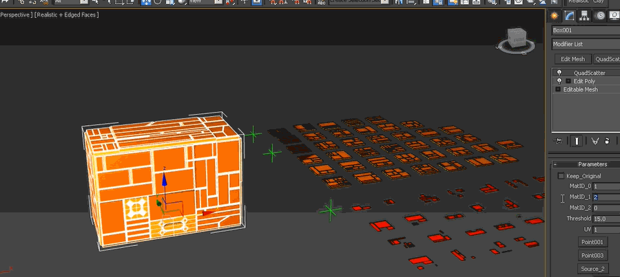 QuadScatter是一款MCG修改器,可以沿着定点法线通过参数设置在四边形上散步对象,非常适合铁丝网、机织织物和砖石等的制作,也能够在表面创建连续的几何图案,或者选择部分散步对象拟合四边形,并将起延伸到边界之外。