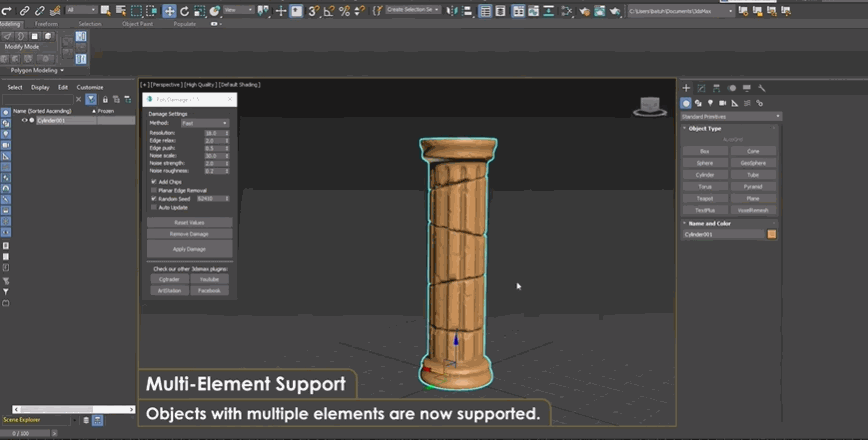 Poly Damage是开发商PolyDesign发布的一款适用于3ds Max 2013-2022的插件,仅需单击一下就能选择模型,为混凝土墙、石头和柱子等创建部分损坏、磨损和撕裂等效果的工具,1.5版本增加了对多元素的支持、精确或快速模式选项。