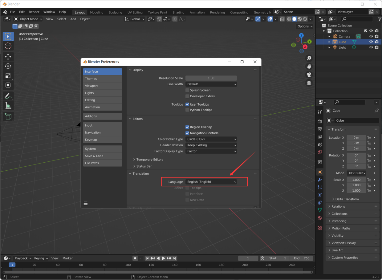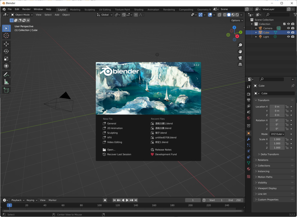 当我们第一次打开blender的时候会出现启动页面和语言设置界面,因为我的是已经安装好的了就不会出现语言设置选项了只有一个启动页面