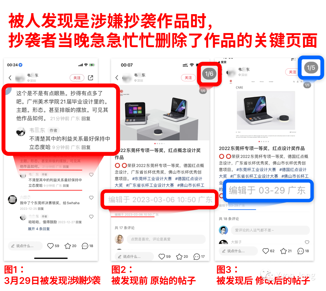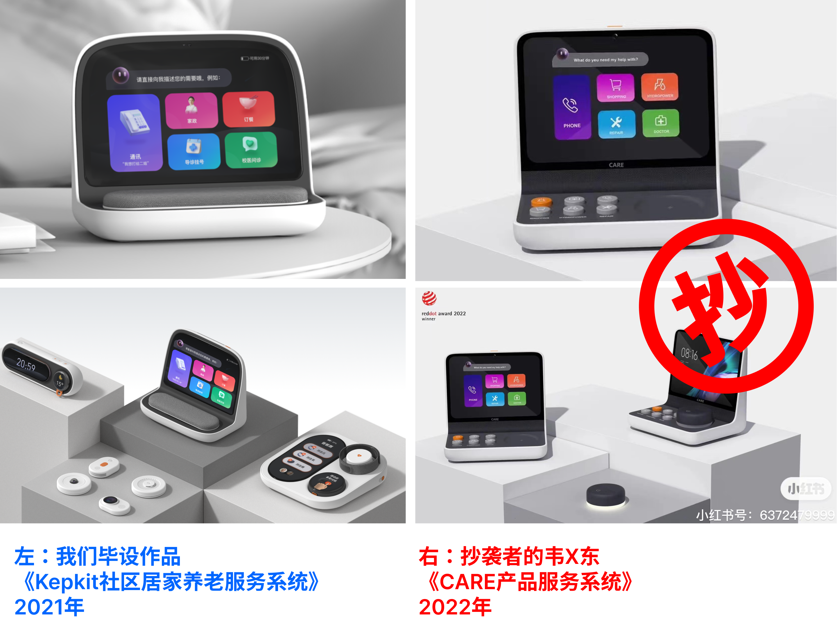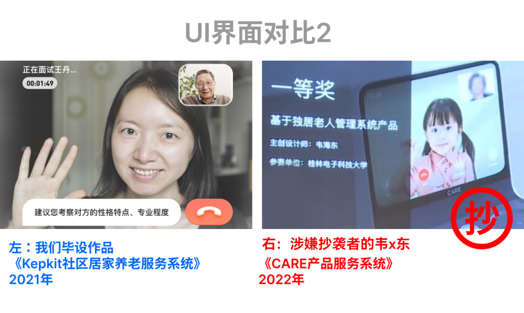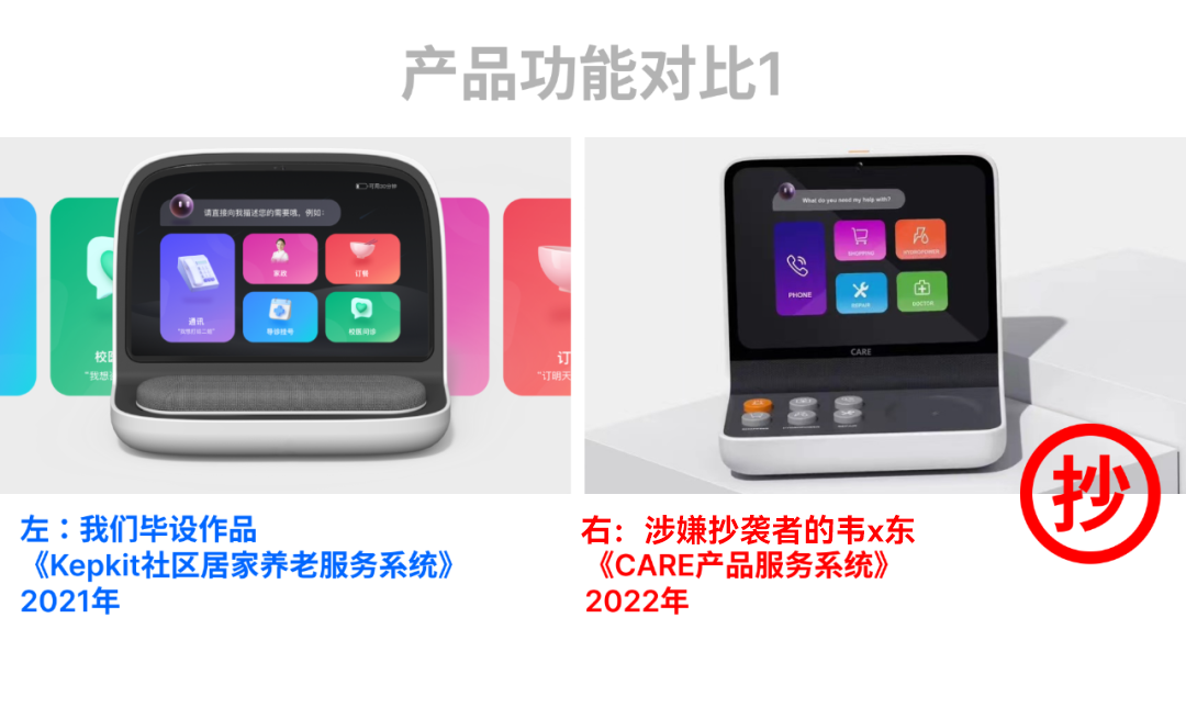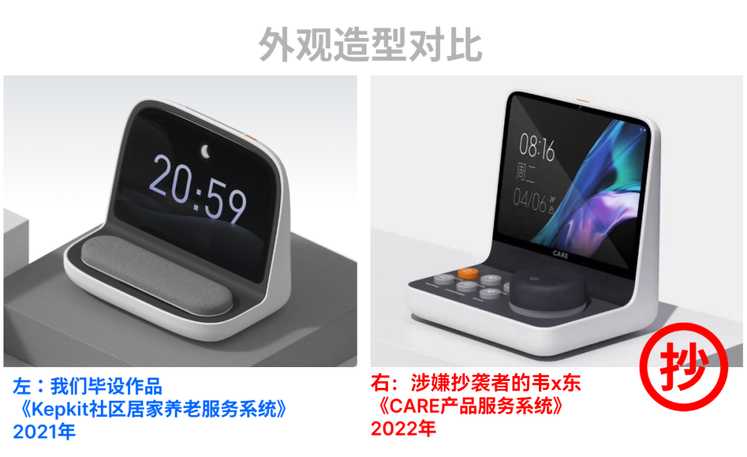 ▲我们的优秀毕业作品(2021年广州美术学院)——Kepkit社区居家养老服务系统与产品创新,竟然被一位叫韦*东的设计师涉嫌抄袭,投递并获得了2022年红点概念奖、东莞杯专项奖以及佛山市长杯等多个设计竞赛。