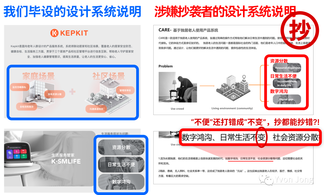 上图左侧是我们的毕设的设计系统,及其中一个产品(生活服务管家),蓝框标注的是我们基于实际调研发现的生活现状和问题;右侧是涉嫌抄袭作品投递比赛的设计说明,通过对比发现,涉嫌抄袭者在问题和设计描述上几乎是一比一的复制粘贴。细心点的话还会发现,他连我们的黑底背景都完全粘贴了过去,只把“中文”转译成了“英文”.....