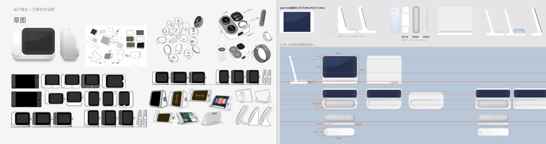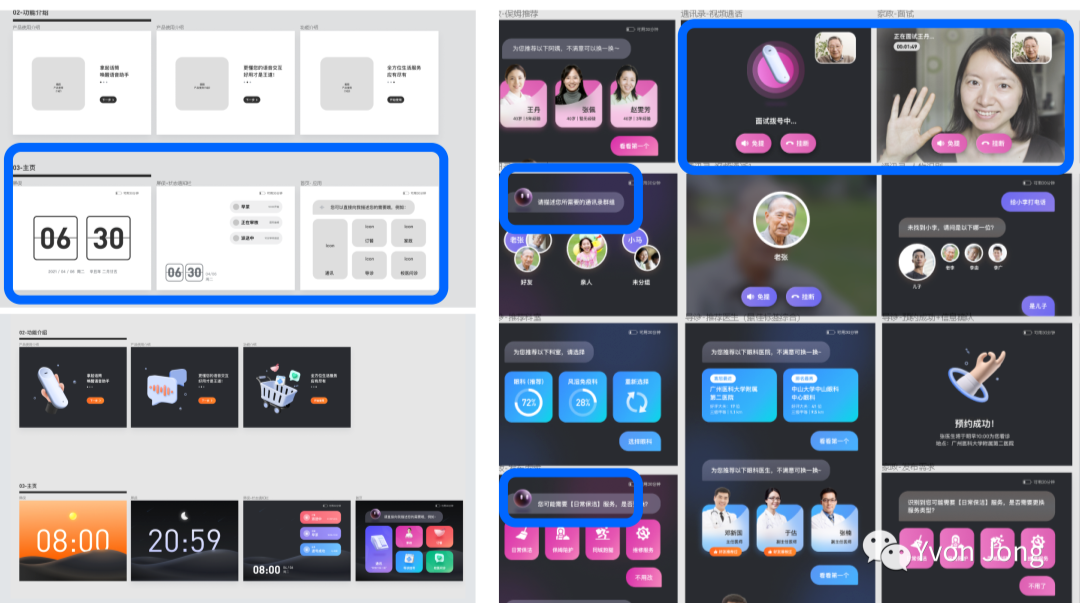 另外智能硬件的显示屏幕太小、也是抱怨老年人最多的事情,所以在整个造型设计上,我们采用了较大尺寸的屏幕进行设计,整体造型上我们使用大倒角,屏幕倾斜、配合实体语音助手等设计手法,希望产品使用体验更佳。