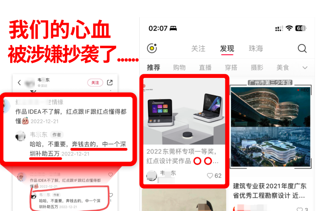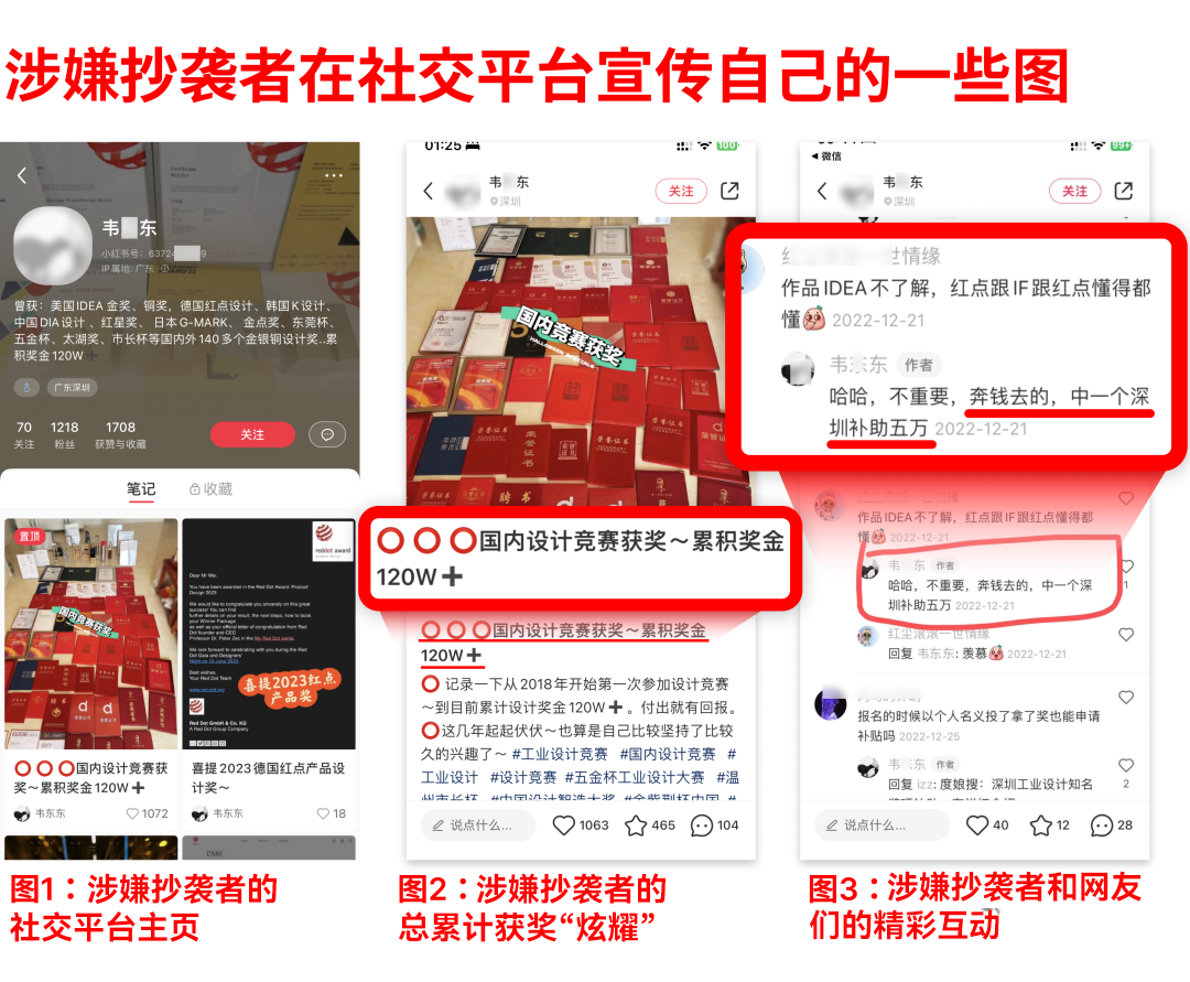 靠涉嫌抄袭拿了红点奖,公然炫耀涉嫌抄袭作品,并售卖获奖名额,毫不掩饰地表示目的只是为了拿取深圳补贴5W,一边涉嫌侵权,一边获奖,一边卖奖,还要脸吗?