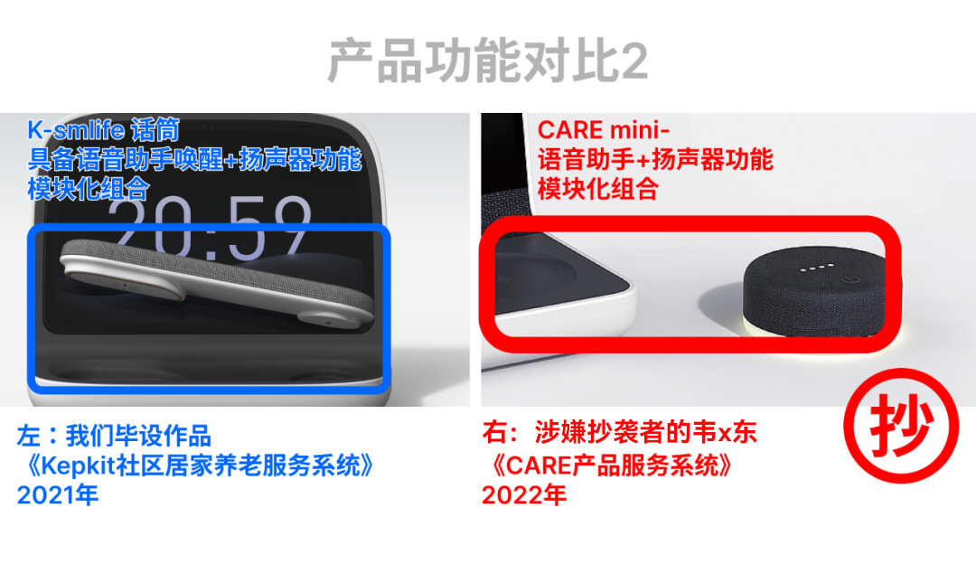韦X东CARE系统中的智能语音助手CARE Mini与我们毕设中的K-Smlife 话筒在功能和设计上也有惊人的相同!不管是主要界面的功能、还是产品细节的功能,都存在明显的涉嫌抄袭痕迹。