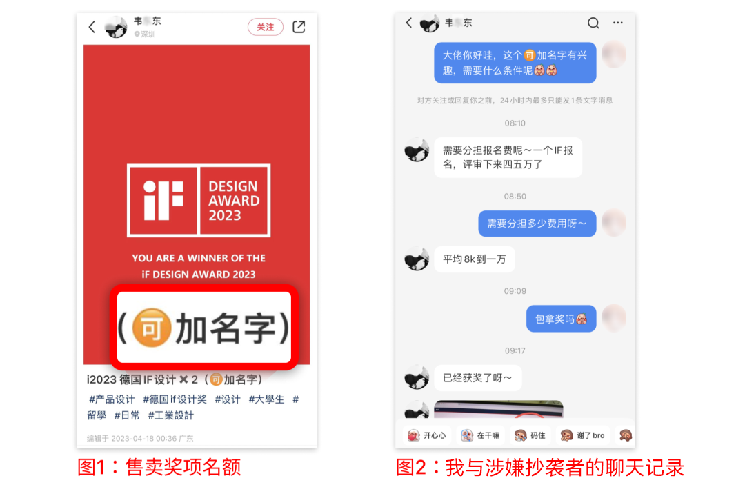 另外,我们还发现抄袭者在小红书上平台公然售卖IF等奖项名额,我们申请了个小号与涉嫌抄袭者私信,得知一个奖项名额售价大约为1万元!并从私聊中,我们还得知涉嫌抄袭作品也在美国IEDA比赛中获奖,目前处于评级阶段!!