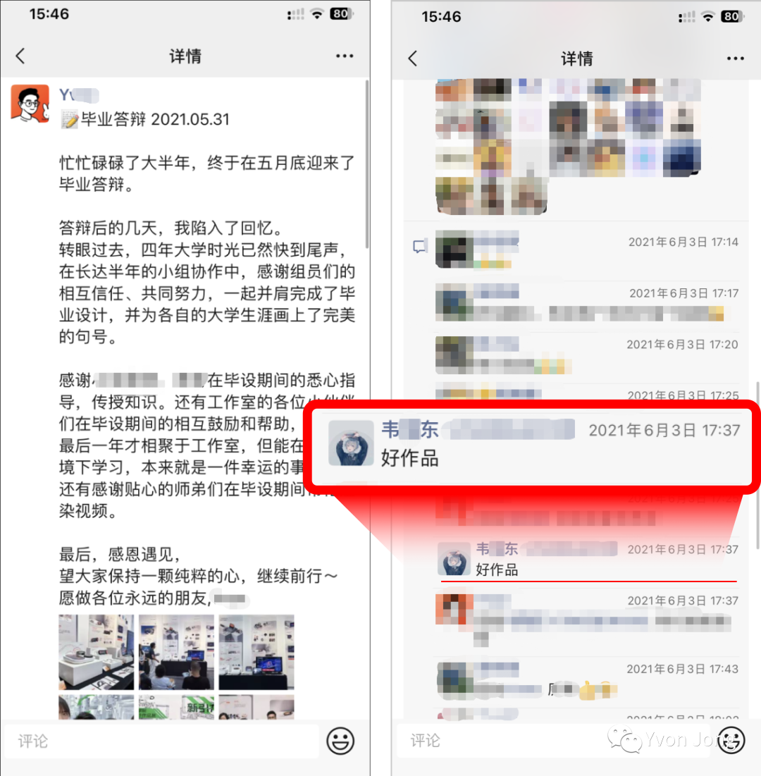 值得一提的是,我在朋友圈发布记录后,韦X东在2021年6月3日评论我们的作品,称赞“好作品”。没想到简简单单的三个字,竟在时隔一年就把我们的作品涉嫌抄袭了,请问这是“踩点标记行为”吗?
