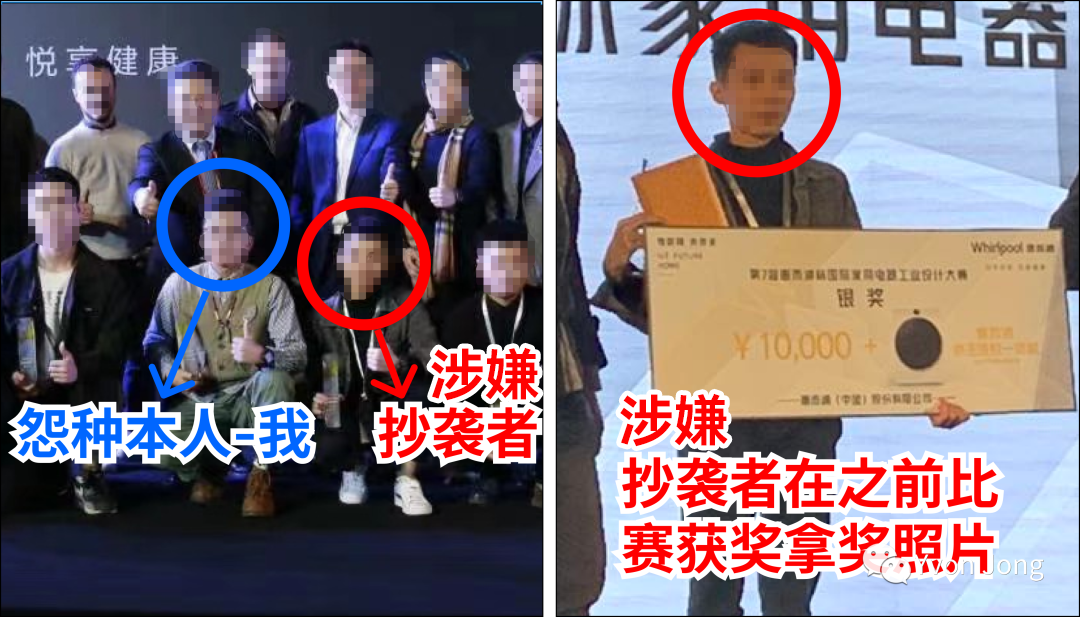 当然,我和涉嫌抄袭者只有一面之缘,就和他在片场上简单聊过几句,对他的印象也仅仅来自他闲聊时的自述:“这个奖(第七届惠而浦比赛)比赛奖金我觉得并不多,也就1W块。我投递多是国内奖金多的设计比赛,经常拿奖。”