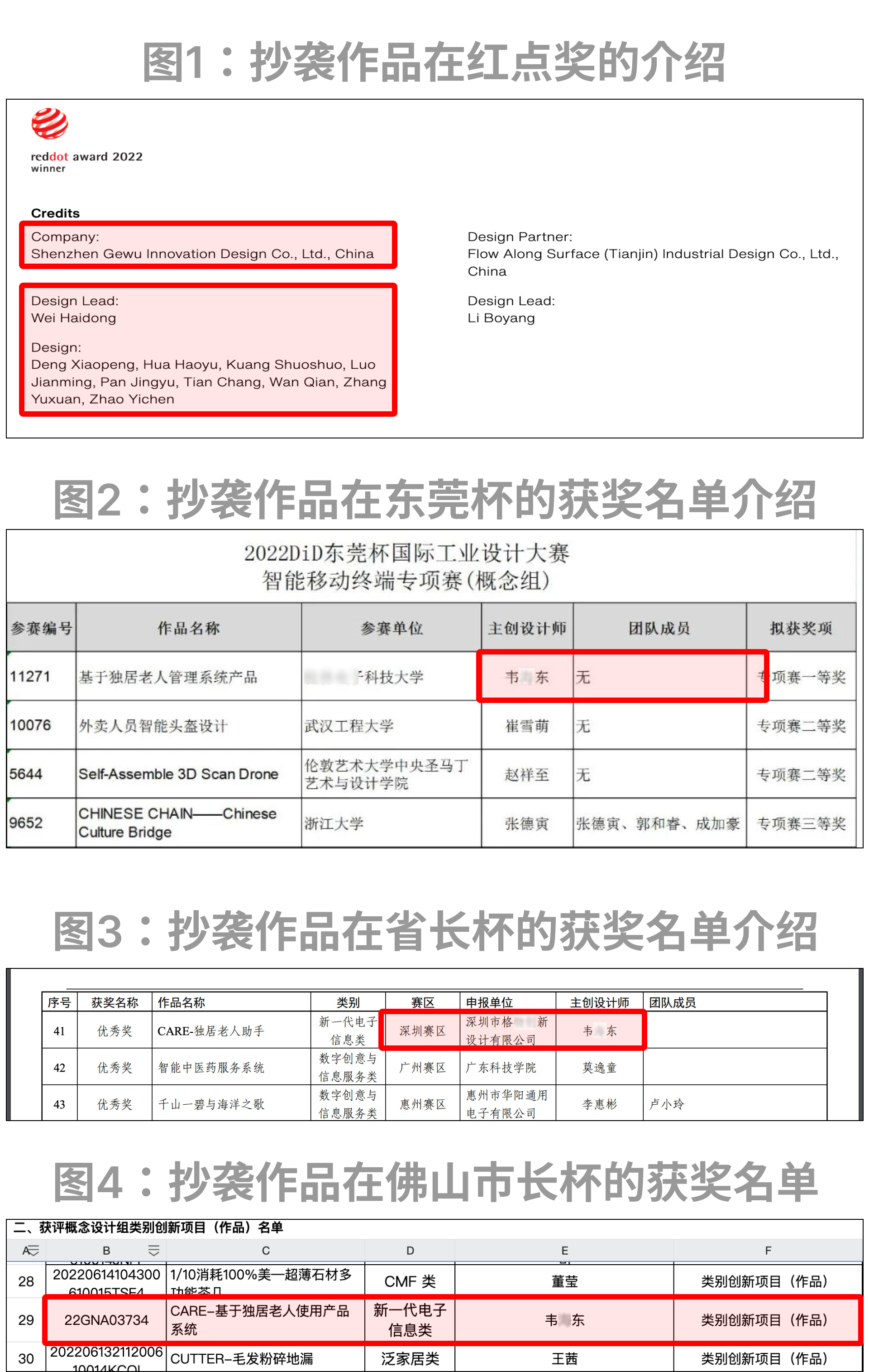 但在图2、图3、图4的东莞杯、省长杯、佛山市获奖名单里,涉嫌抄袭者只写了自己名字作为主创设计师,没有写其余团队成员;