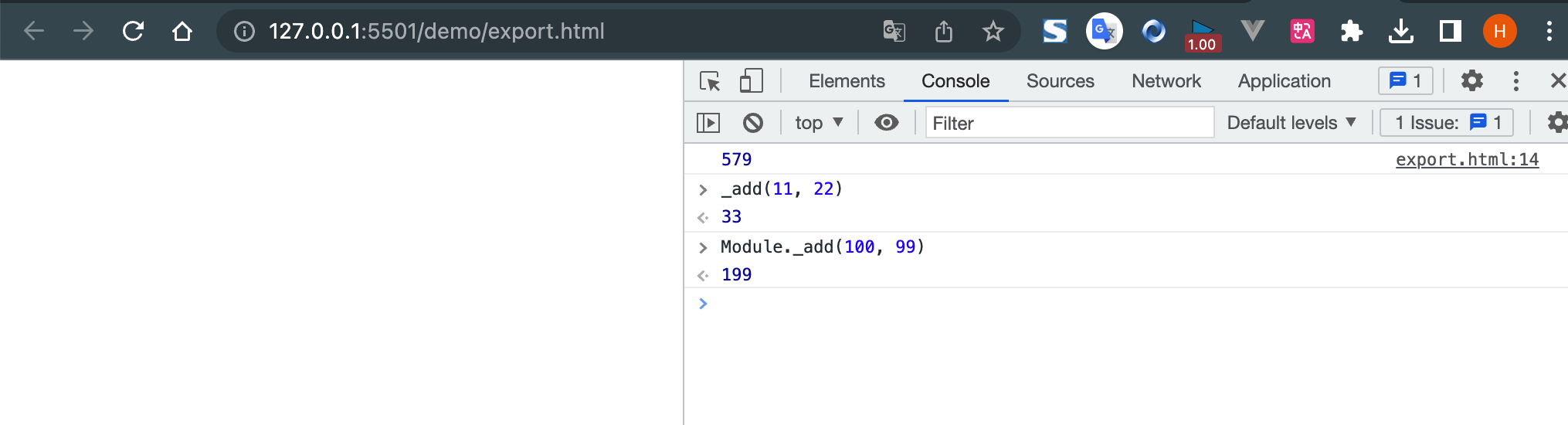 目录中生成文件:`export.js`和`export.wasm`。继续在浏览器中测试我们的代码,新建一个`export.html`文件,代码如下: