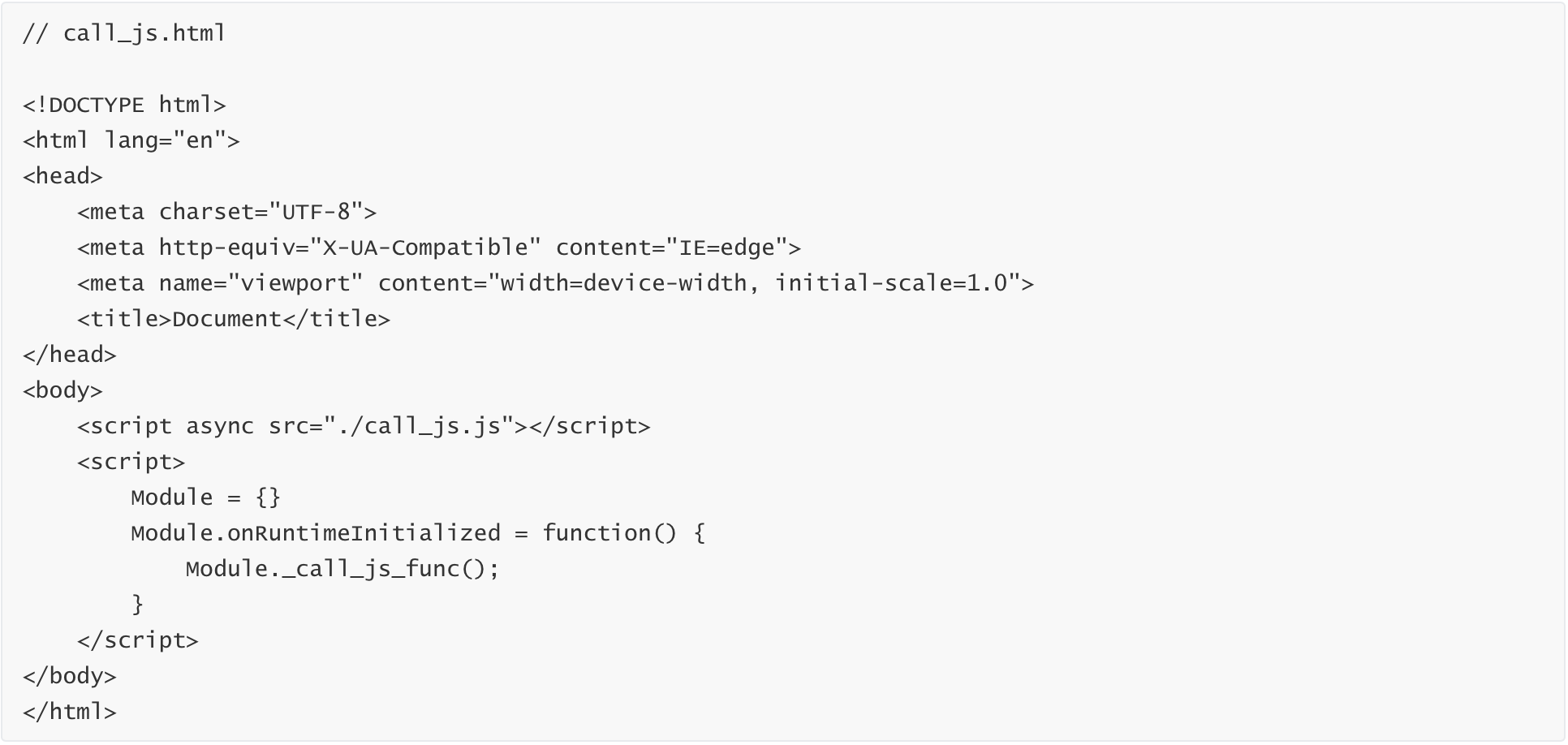 WebAssembly实例是通过方法createWasm()异步创建的,有可能js文件加载后,Emscripten运行环境没有准备好,我们需要通过建立一种Emscripten运行时准备就绪的机制。一种简单的方法就是使用onRuntimeInitialized回调方法,在这个回调方法中运行WebAssembly Module导出的方法。