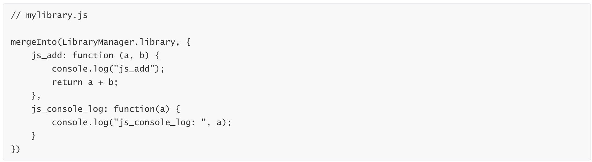 按照在C++文件中声明的方法签名,在js文件中实现了`js_add`和`js_console_log`的方法功能,并合并注入到`LibraryManager.library`中。`LibraryManager.library`对象可以简单理解为是JavaScript注入到C/C++中的运行时库。