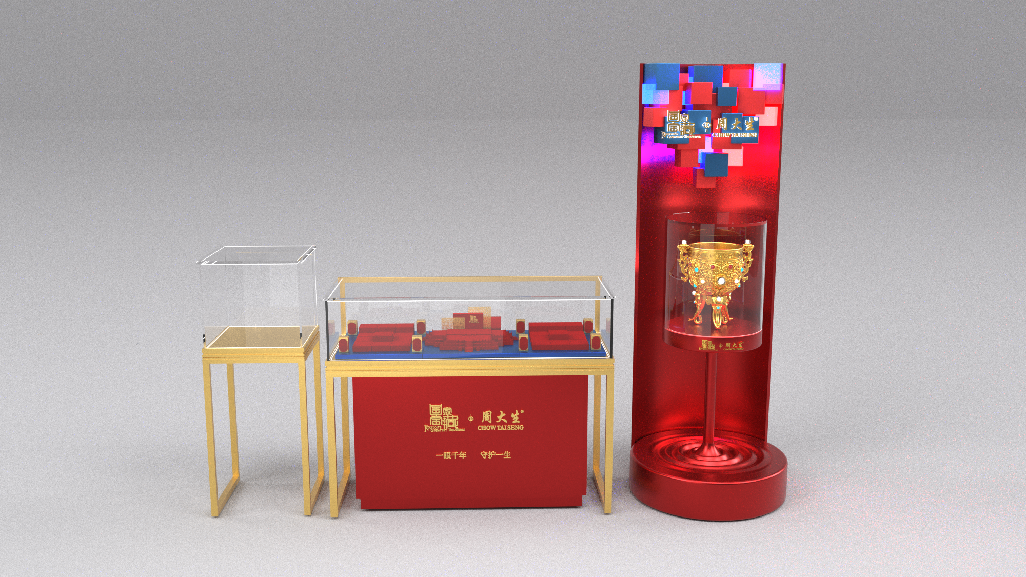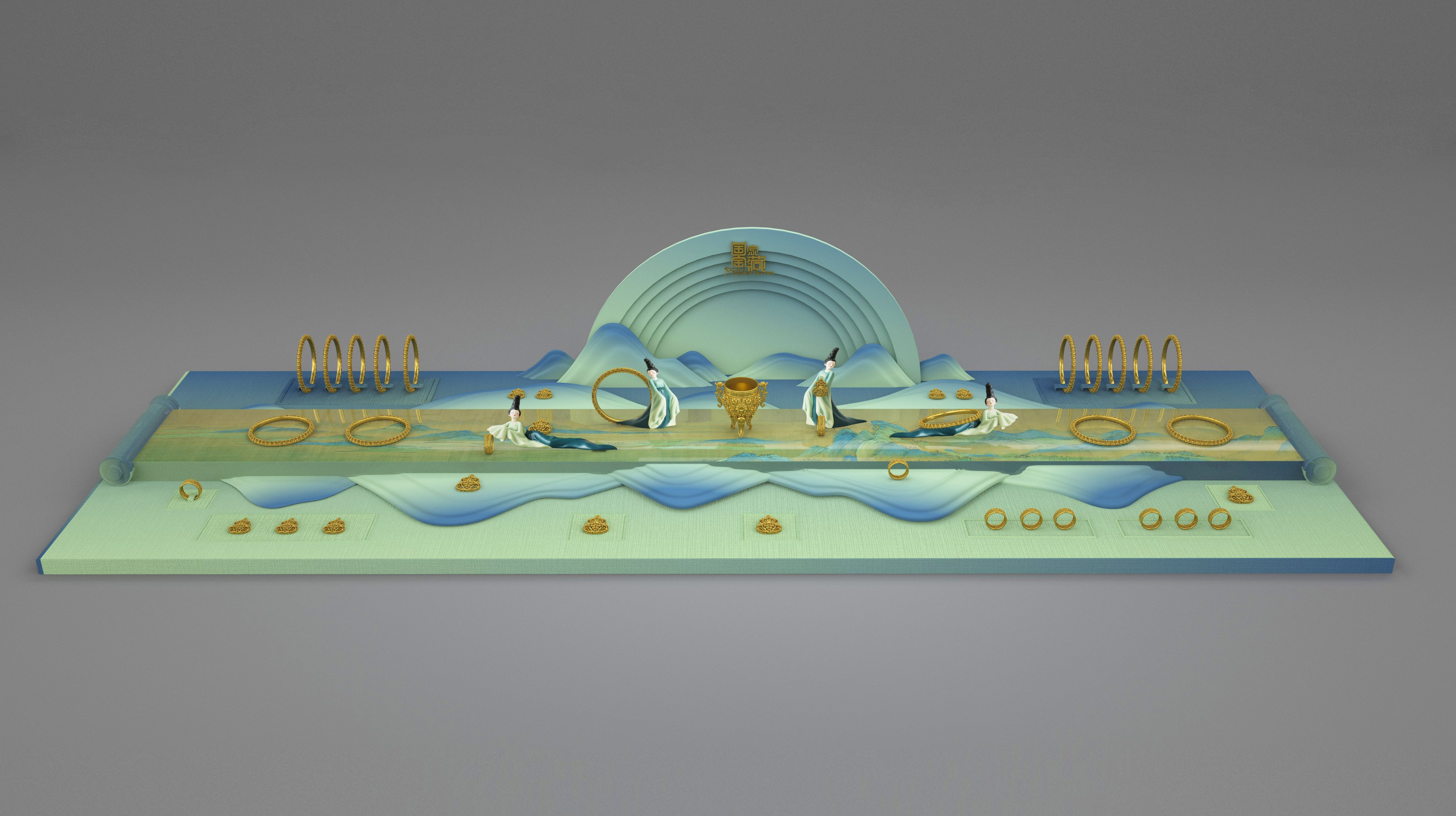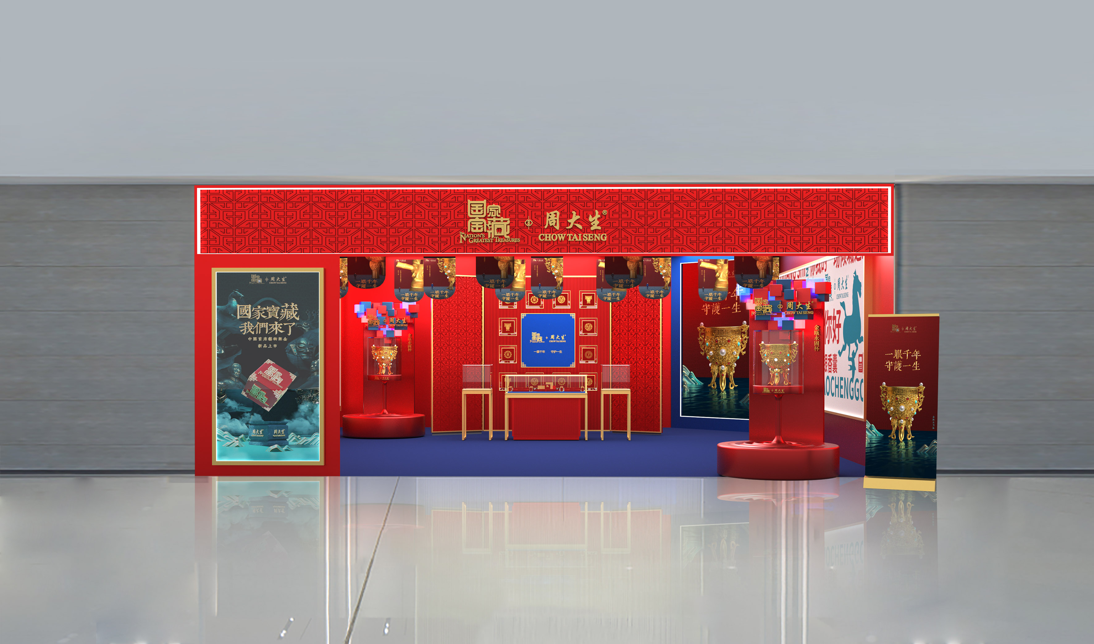 终端门店引流上,禾桃创意通过一系列的营销物料加持,营造氛围感,同时根据消费者打卡需求,设计了具有互动感的快闪,让消费者近距离感受国宝金器的魅力。
