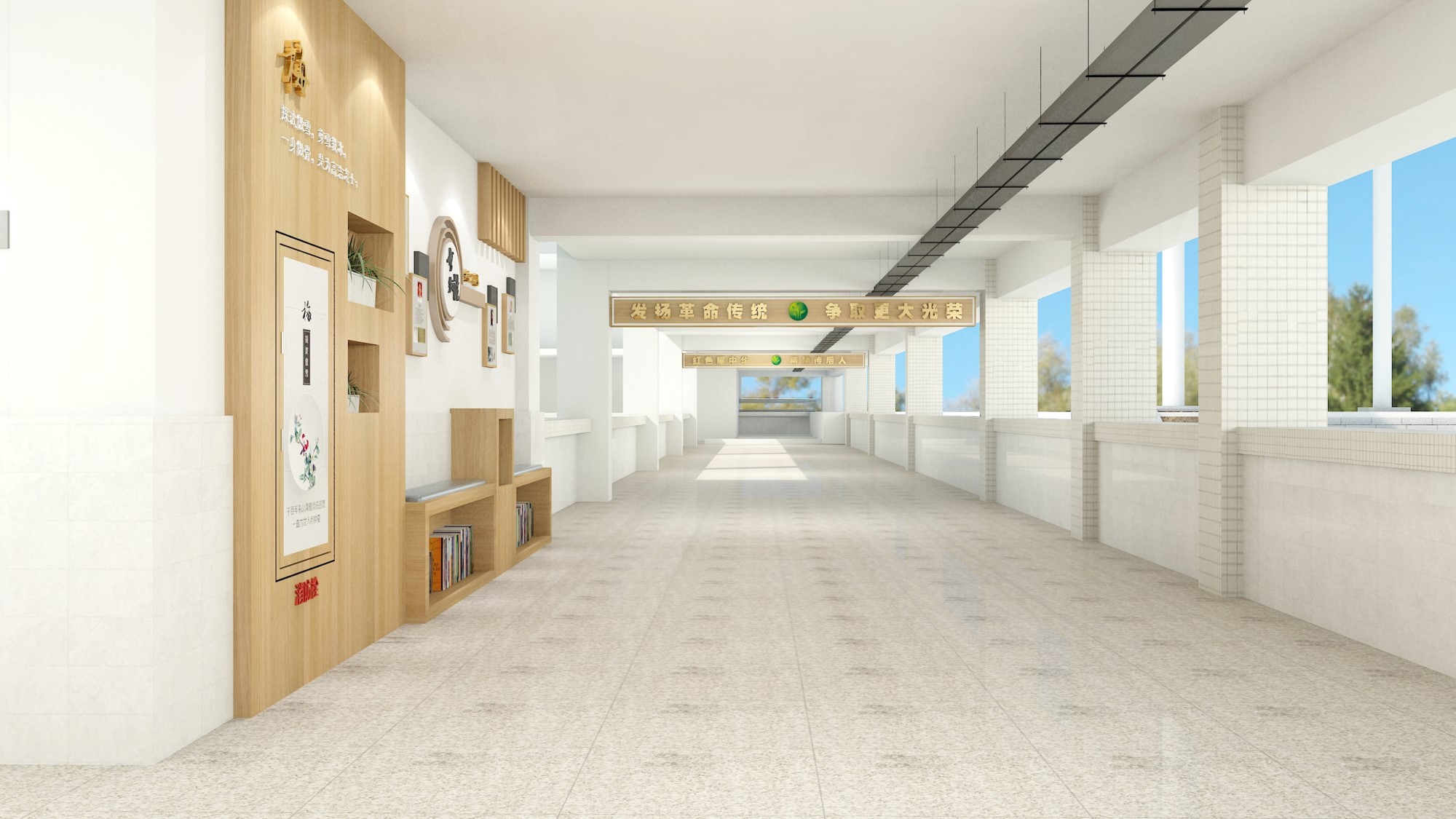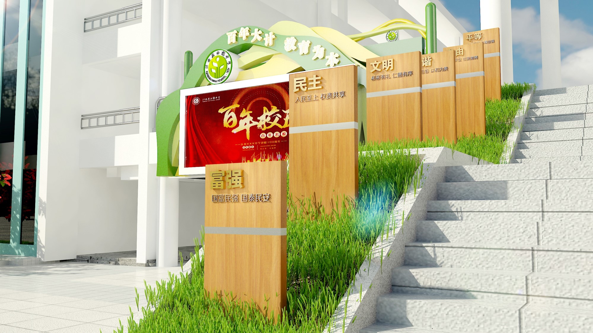 教学楼设计内容:①核心价值观②休闲广场③小品④楼道文化⑤走廊文化