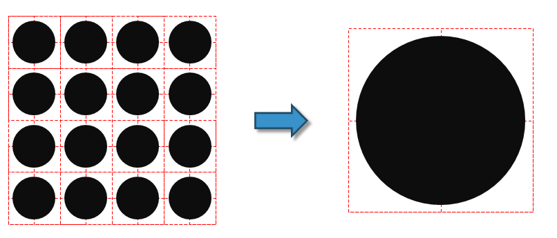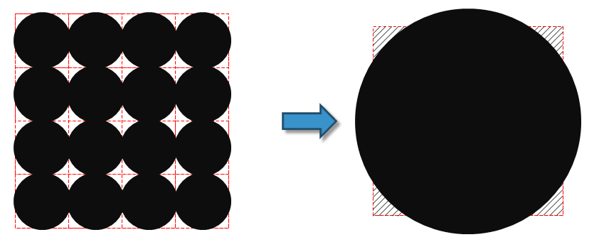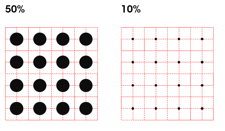 圆和圆已经有重叠的部分了。这种情况下,就按阴点子的面积算。即,计算网格单元里面的空白部分(上图用阴影标示)的占空比,假设为15%。然后用100%减去这个数,就是85%。嗯,所以还是有点麻烦的。。。╮(╯_╰)╭