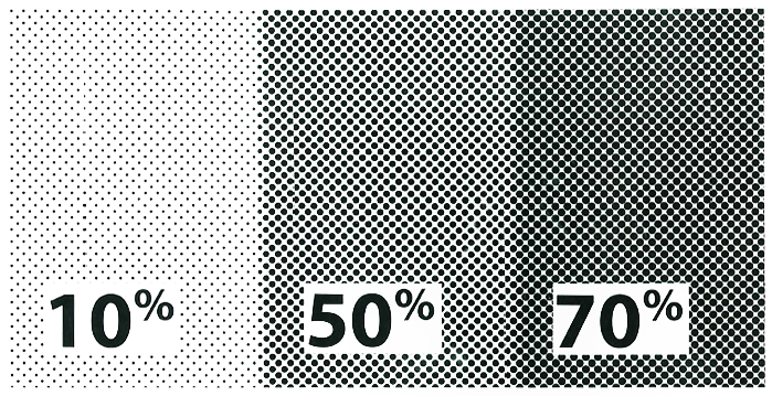 被圆点覆盖的四个小格子,组成了一个网格单元。假设每一个网格单元(注意不是最小的那种格子!)的边长是1厘米,面积就是1平方厘米。当圆点的面积对网格单元面积的覆盖率是70%的时候,也就意味着圆点面积是0.7平方厘米,圆的直径就是0.944厘米。这就是70%的网点。