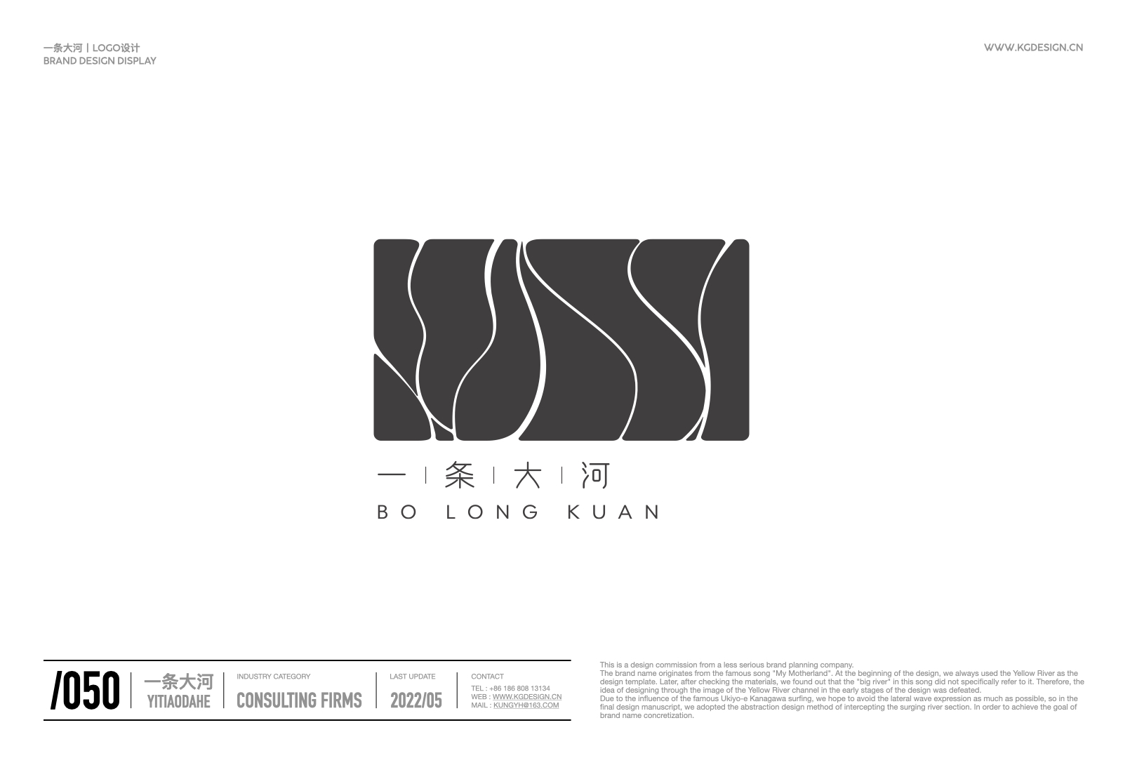 一条大河名字虽好,理解上却有着鲜明的文化隔阂。只有中国人才能理解名字背后的意义与相应的旋律。故而这个Logo只适合面向国内客户群,这样一来品牌英文名称就不再有意义。但在Logo的排版上又需要这样一个视觉层次。于是在我们的建议下,最终采用了歌词的第二句“波浪宽”的威妥玛拼音来填充英文标准字的位置。本身是个小小的彩蛋,也是这个Logo一个独特的记忆点。