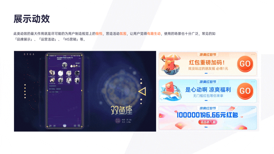 在动效落地阶段,主要分为代码实现、GIF、Lottie、Webp、Apng、Mp4、Pag、Svga、Spline等,不同的格式适用的场景也各不相同,最为常用的动效格式为Lottie、Svga、Pag格式,其中Lottie最为适合制作矢量动效,Svga适用直播类场景动效制作,Pag则适合制作模板类动效。