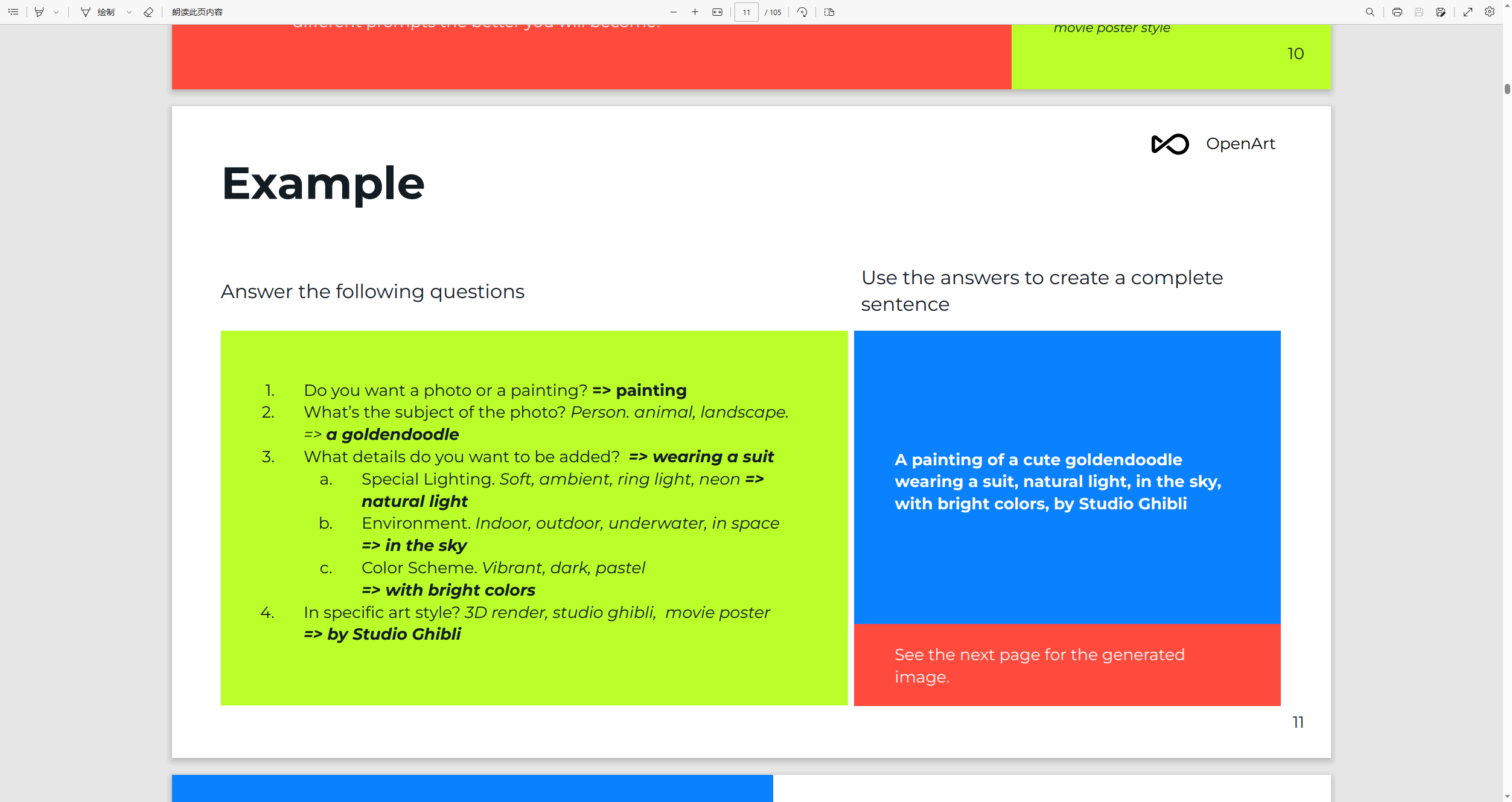 先说一下这本书都讲了些什么吧,首先在前两章这本书先对Stable Diffusion、OpenArt这个平台、提示词工程等进行了简介,然后以一系列提问的方式对提示词的格式进行了示例:
