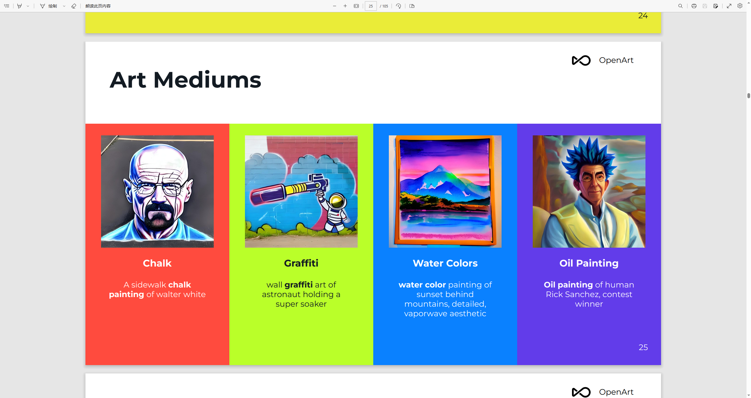 不同的艺术媒介例如粉笔画、水彩画、油画等关键词所呈现的效果: