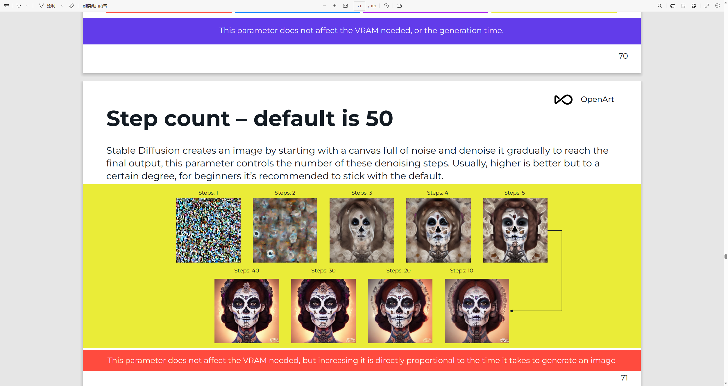 除了提示词相关的内容,书中还介绍了Stable Diffusion的参数,同样以图文并茂方式的展现: