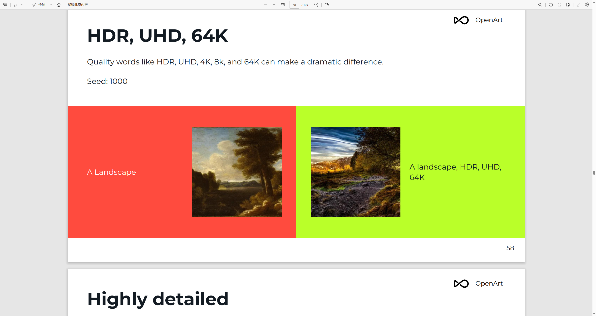 修饰词这一章节介绍完了之后,书中又介绍了一些魔法词,就是一些我们经常见到的HDR、8K、高细节一类可以提高画面质量的关键词: