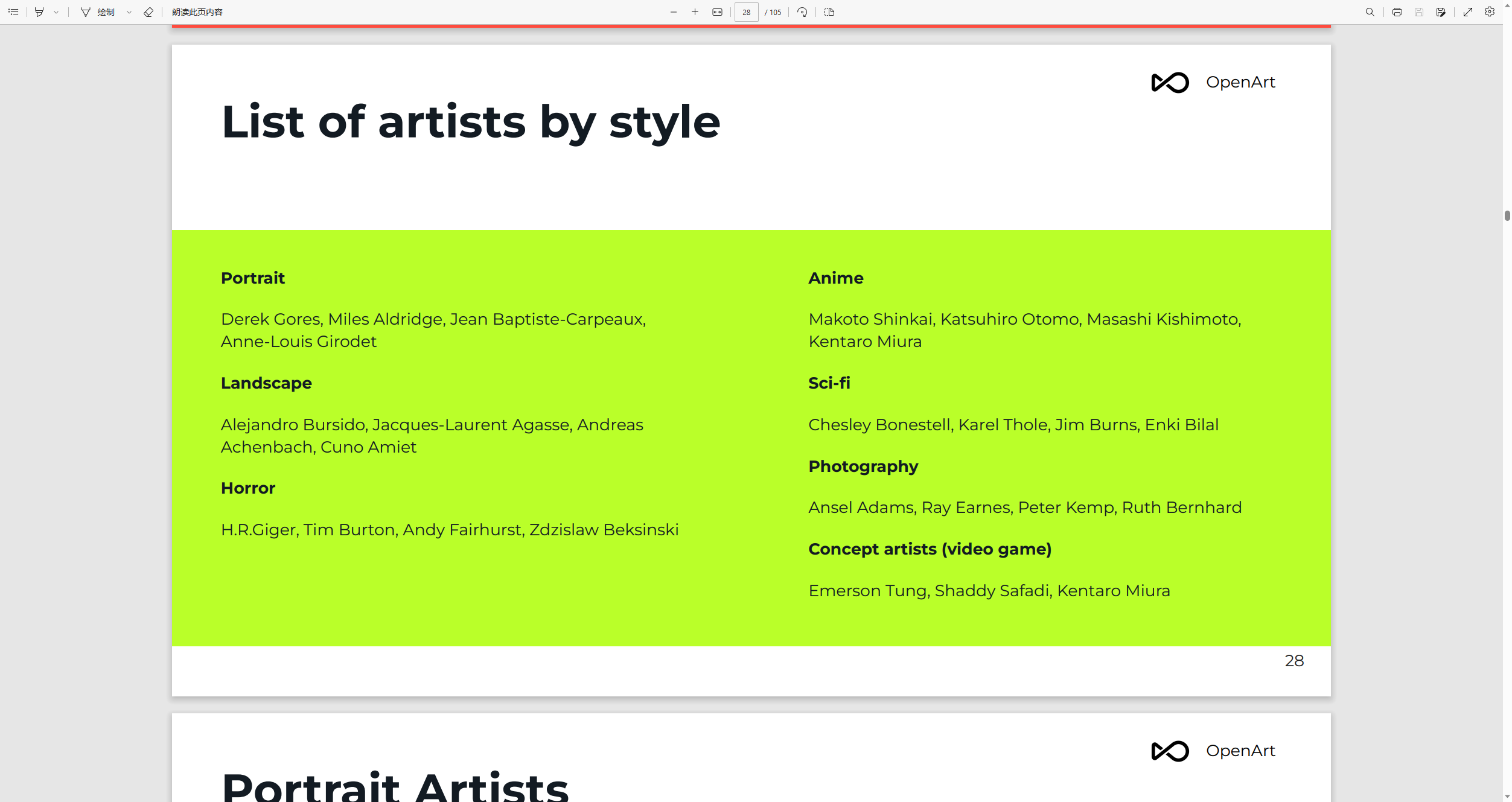 艺术家又按照不同的艺术风格,比如肖像、风景、恐怖、科幻、动漫、摄影、概念等进行了分类列举: