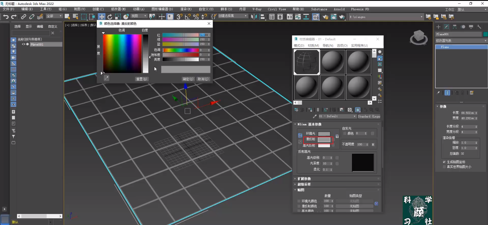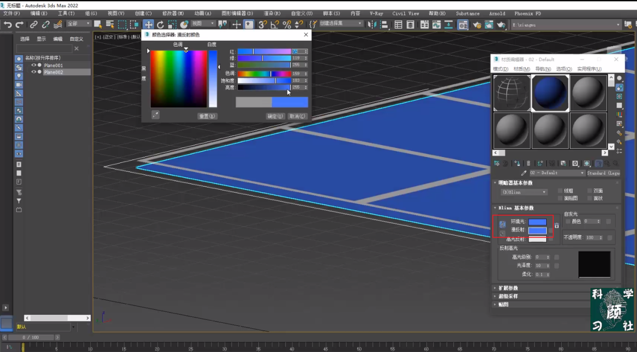 按F键,切换到正视图中,把平面往下复制一份,如果要参数关联,建议【克隆选项】-【实例】中,这样做的好处,两个栅格可以同时变化。选中下面的平面,再增加一个材质,给个蓝色,给些高光,将两个平面打组。