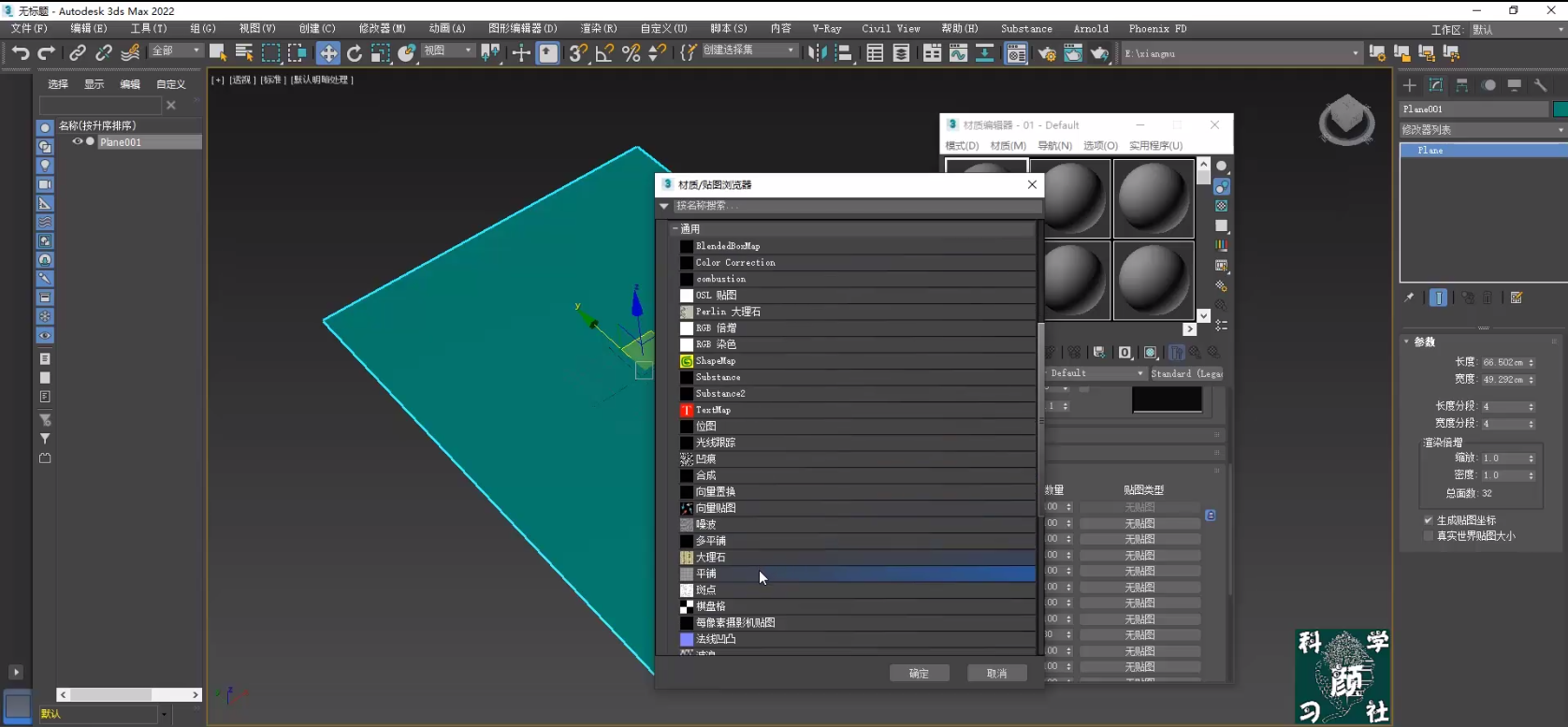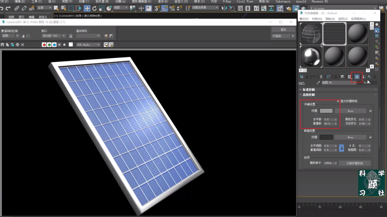 使用模型来制作太阳能板更适合本节课程太阳能面板的制作,进入3ds Max,在顶视图里创建出一个平面,创建模型,打开材质编辑器,进入透视图,调整不透明度,打开材质贴图浏览器,在通用贴图里双击平铺。