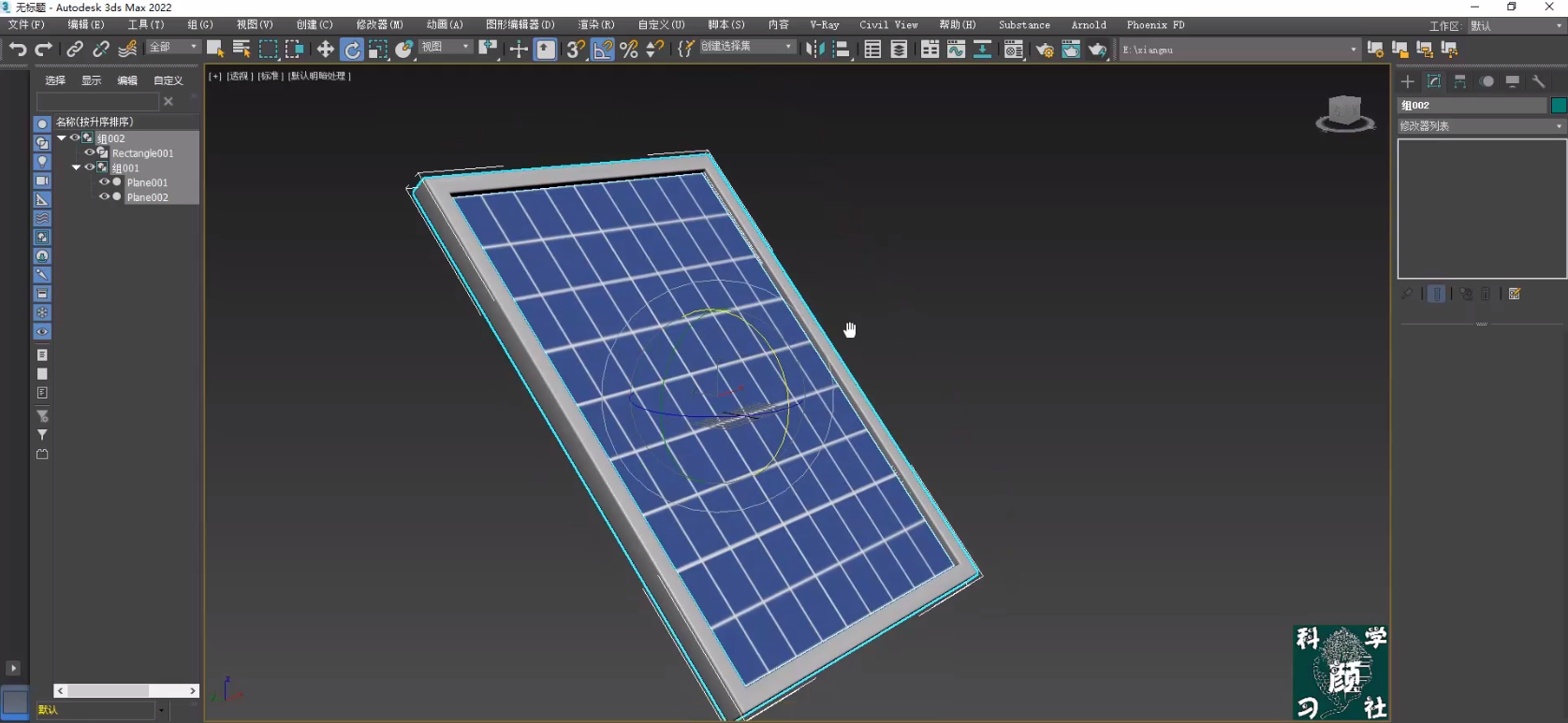 全选中,再打组,把太阳能面板旋转50°,让面板侧立。