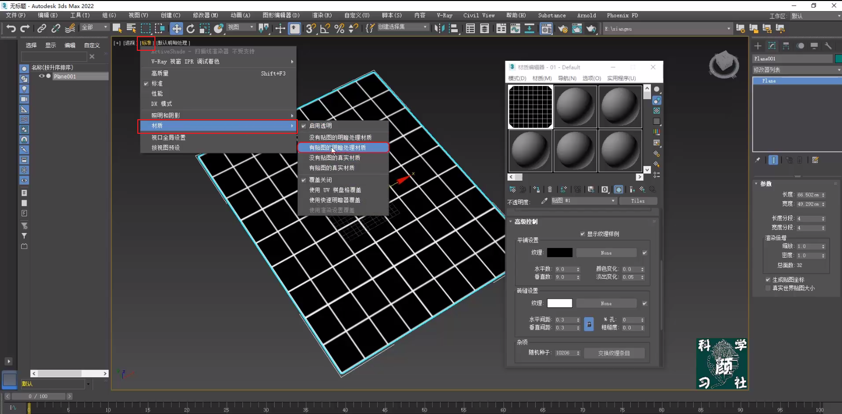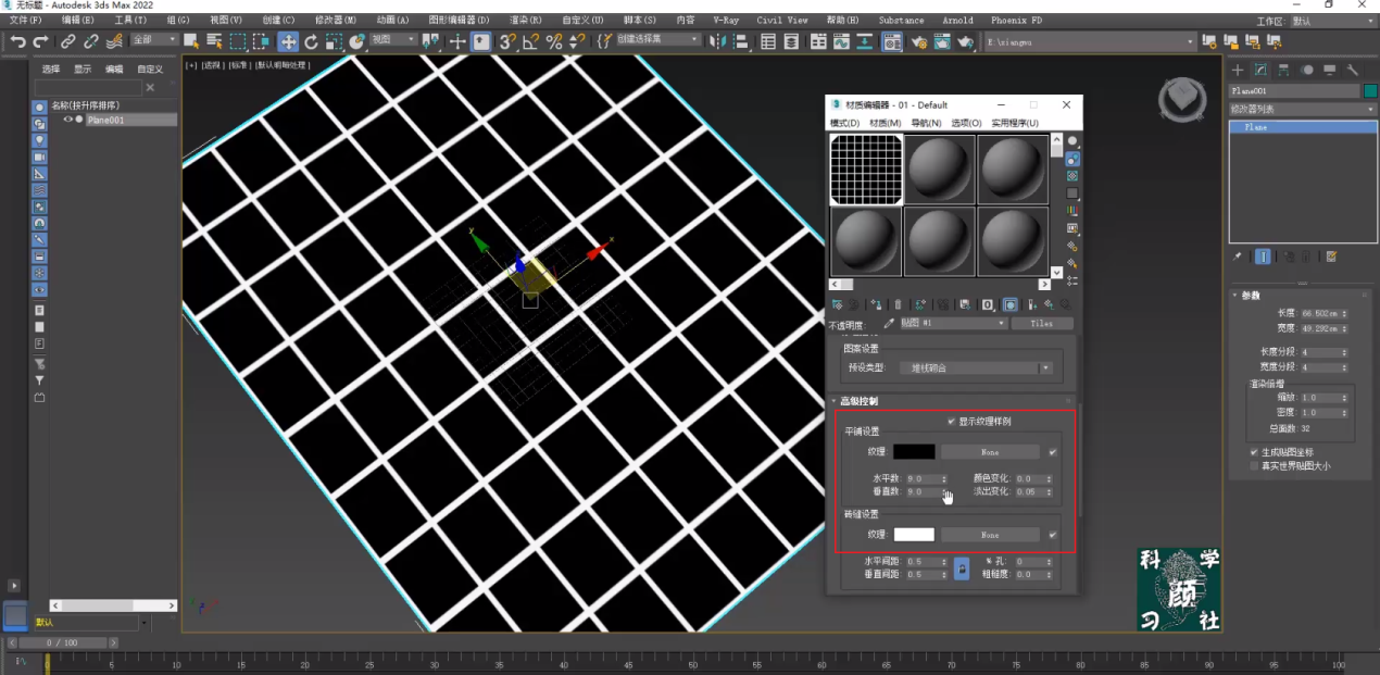 将材质附上,并显示贴图。如果想要增加栅格数,可以调整【平铺设置】中的水平数和垂直数,砖缝设置也可以调整粗细。