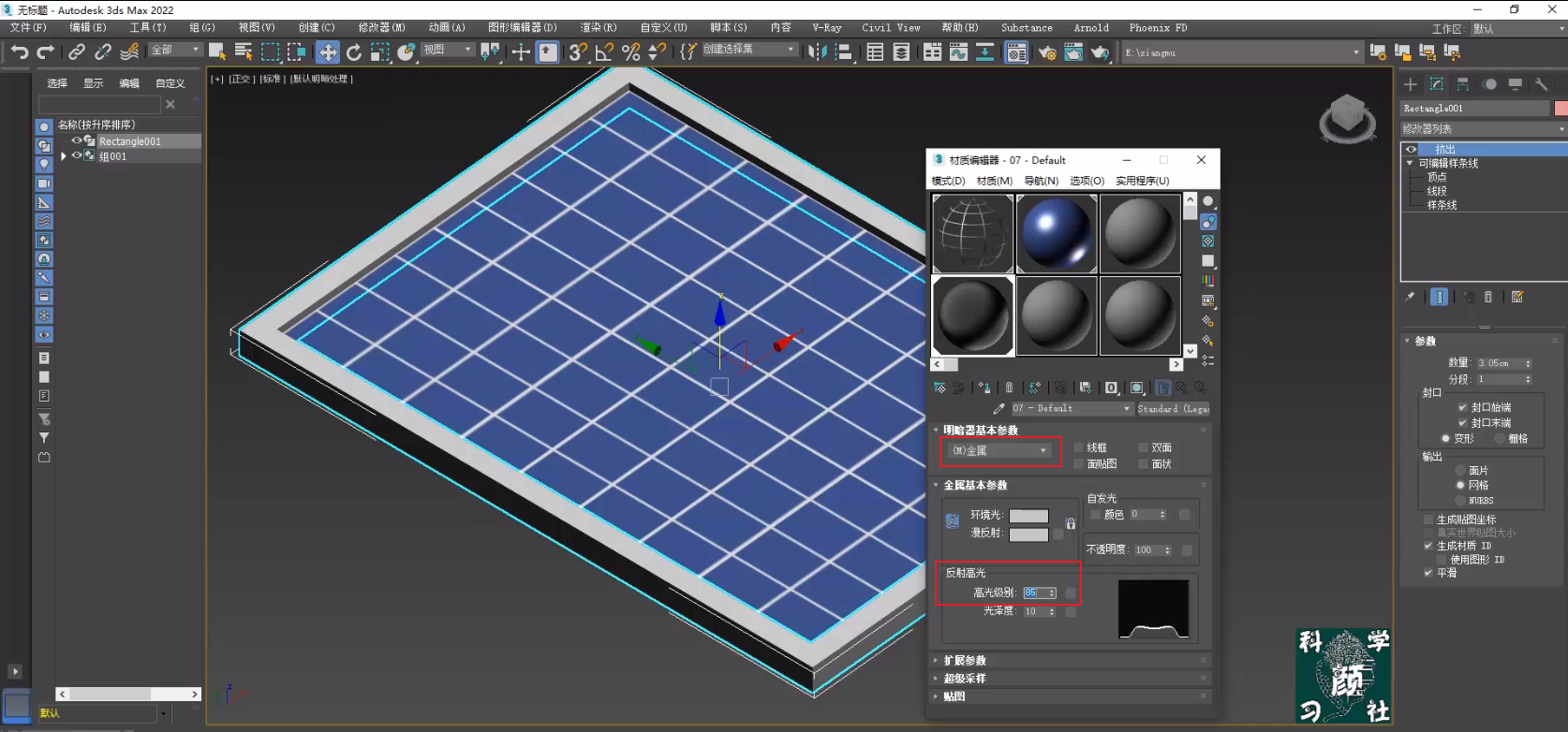 进入修改面板,到可编辑样条线中,选择样条线次物体,选择【轮廓】向外进行偏移,轮廓大小就调整为太阳能板框的长宽度。退出次物体修改器,给出【挤出】修改器,挤出框体厚度,修改材质为金属材质。调整反射高光级别到85,光色度到75。