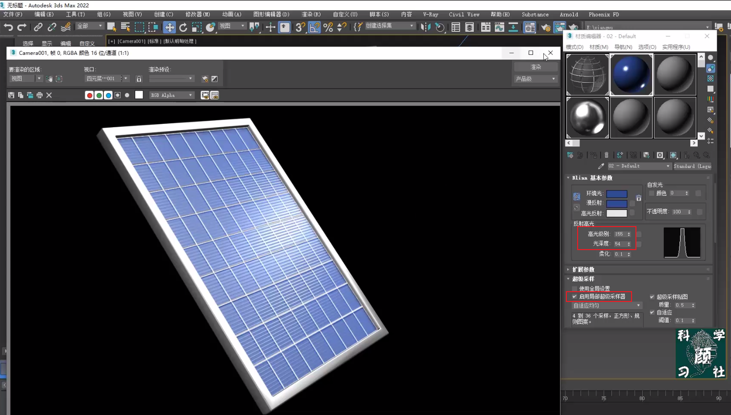 让太阳能面板栅格的凸起线条祛除毛躁的锯齿细节,我们可以采用【超级采样】中【启用局部超级采样器】选择【自适应均匀】。