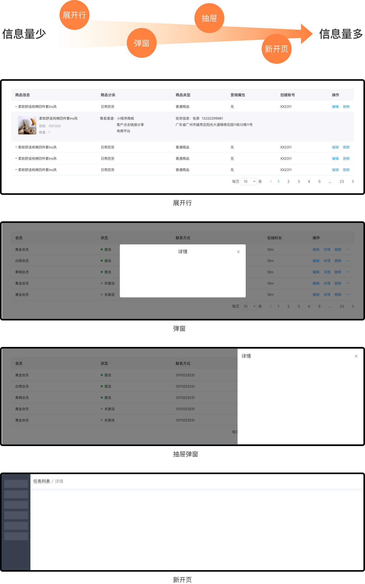· 如果详情内容不多,没有新开页面的必要,我们可以采用展开行、弹窗、抽屉的形式,但是要注意尽量减少过多的样式,避免给用户增加疑惑感。